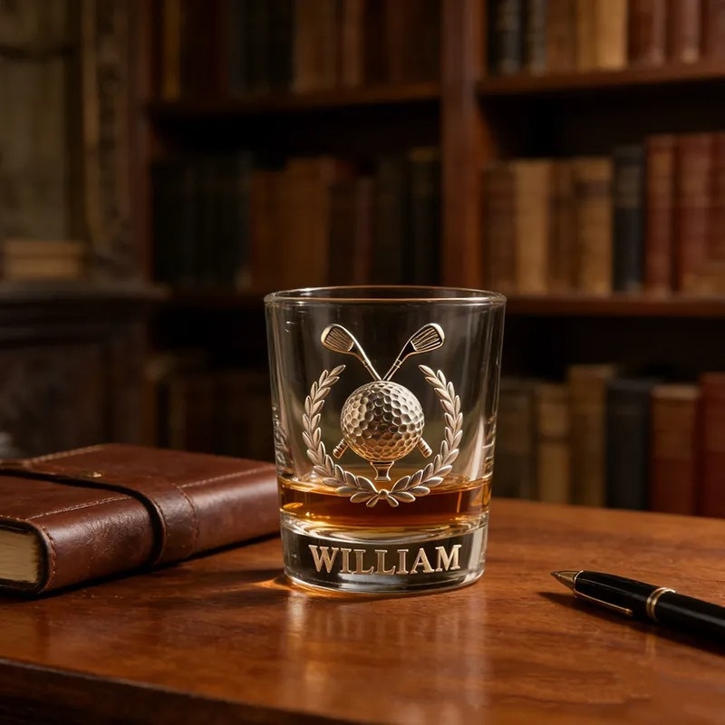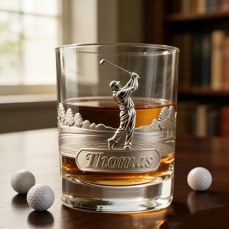 This personalized golf whiskey glass features a custom name and elegant golf-themed design. Perfect for golf enthusiasts, it adds a touch of sophistication to any bar or collection. Ideal for enjoying your favorite drink in style.