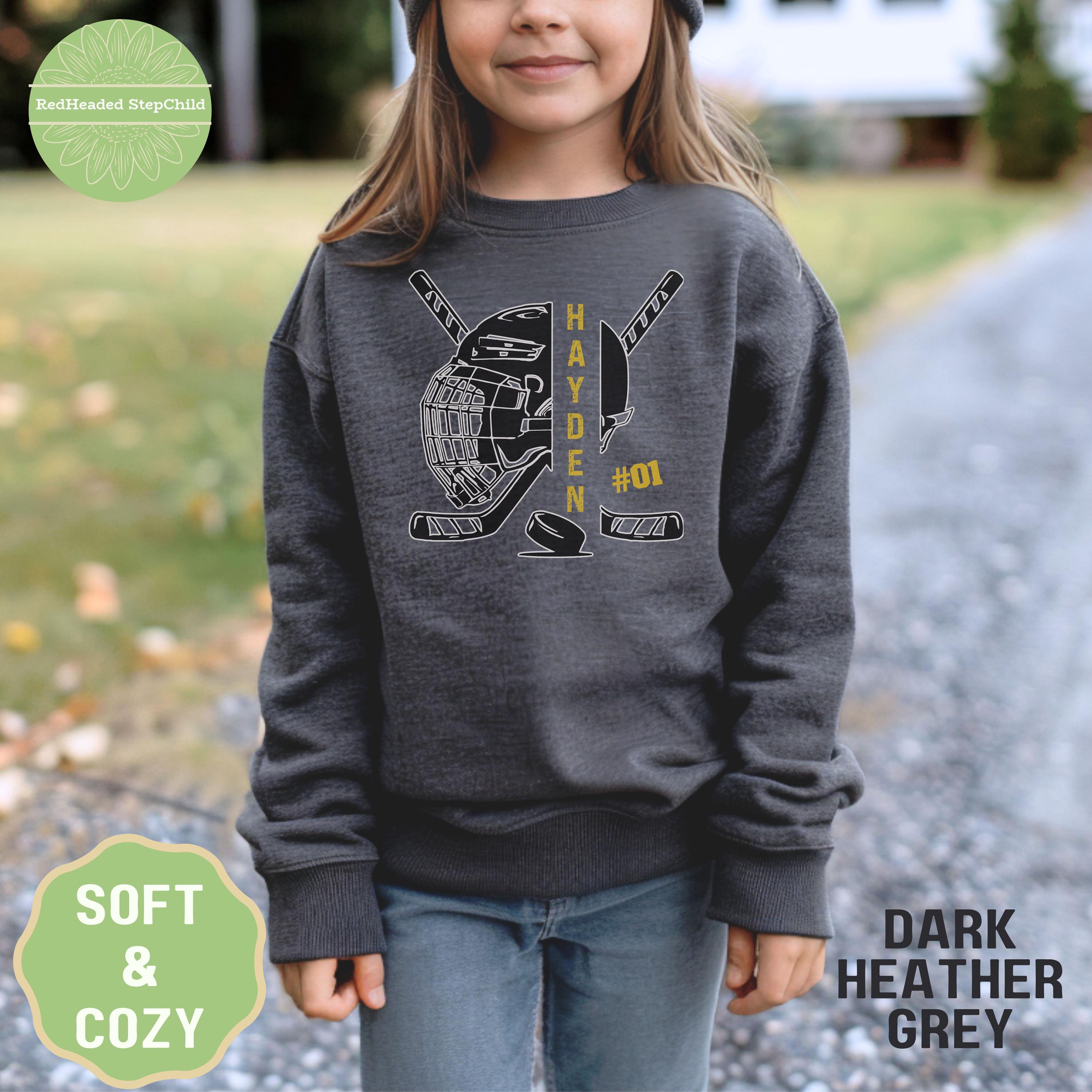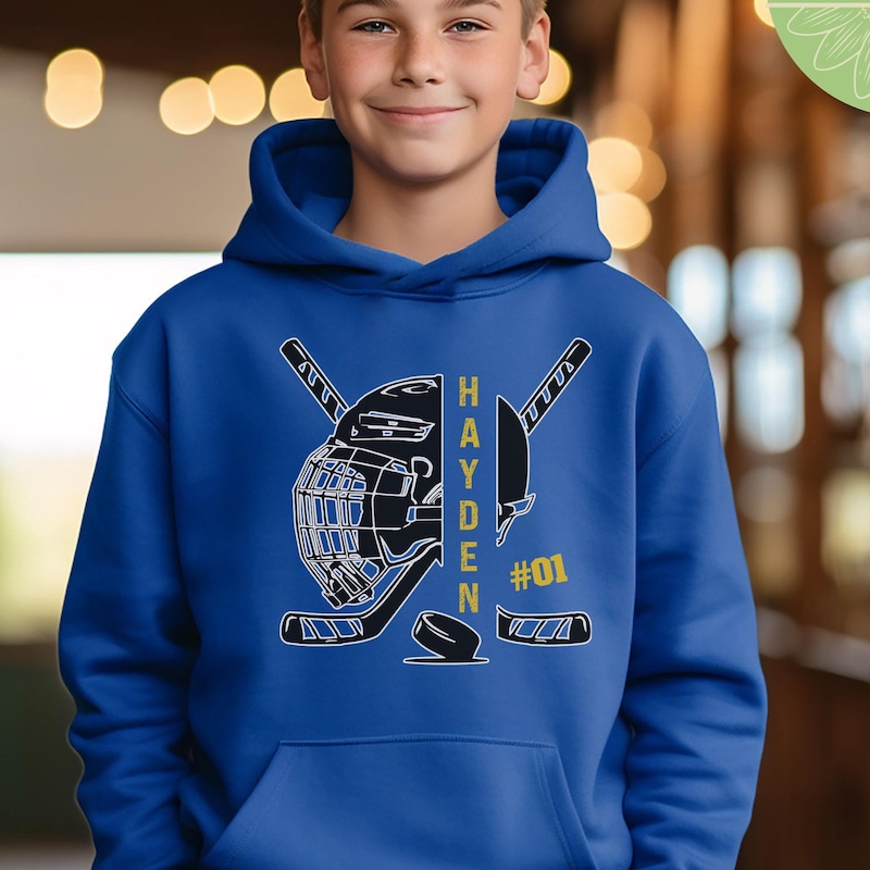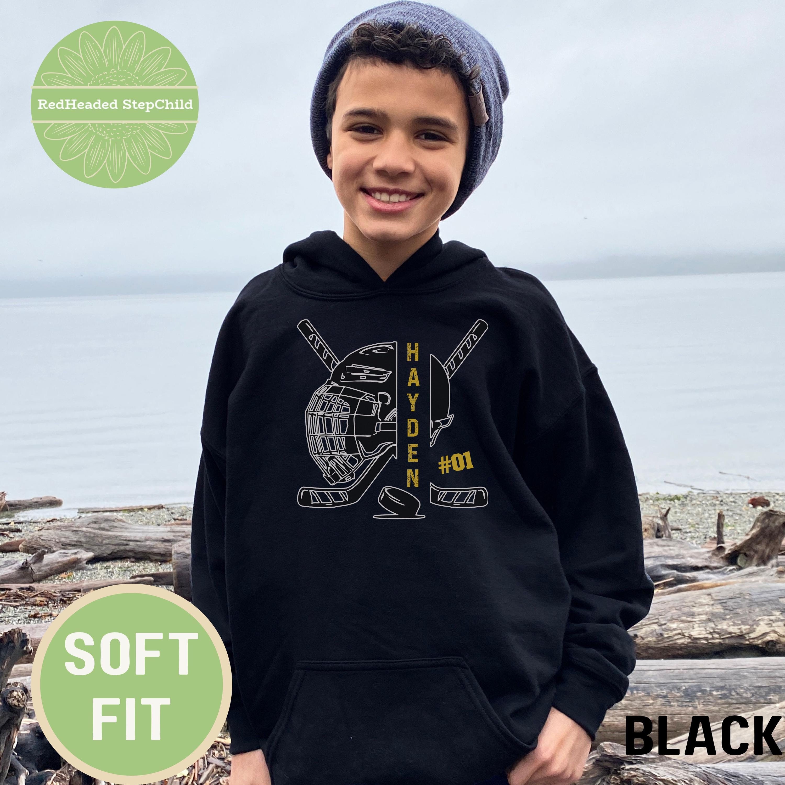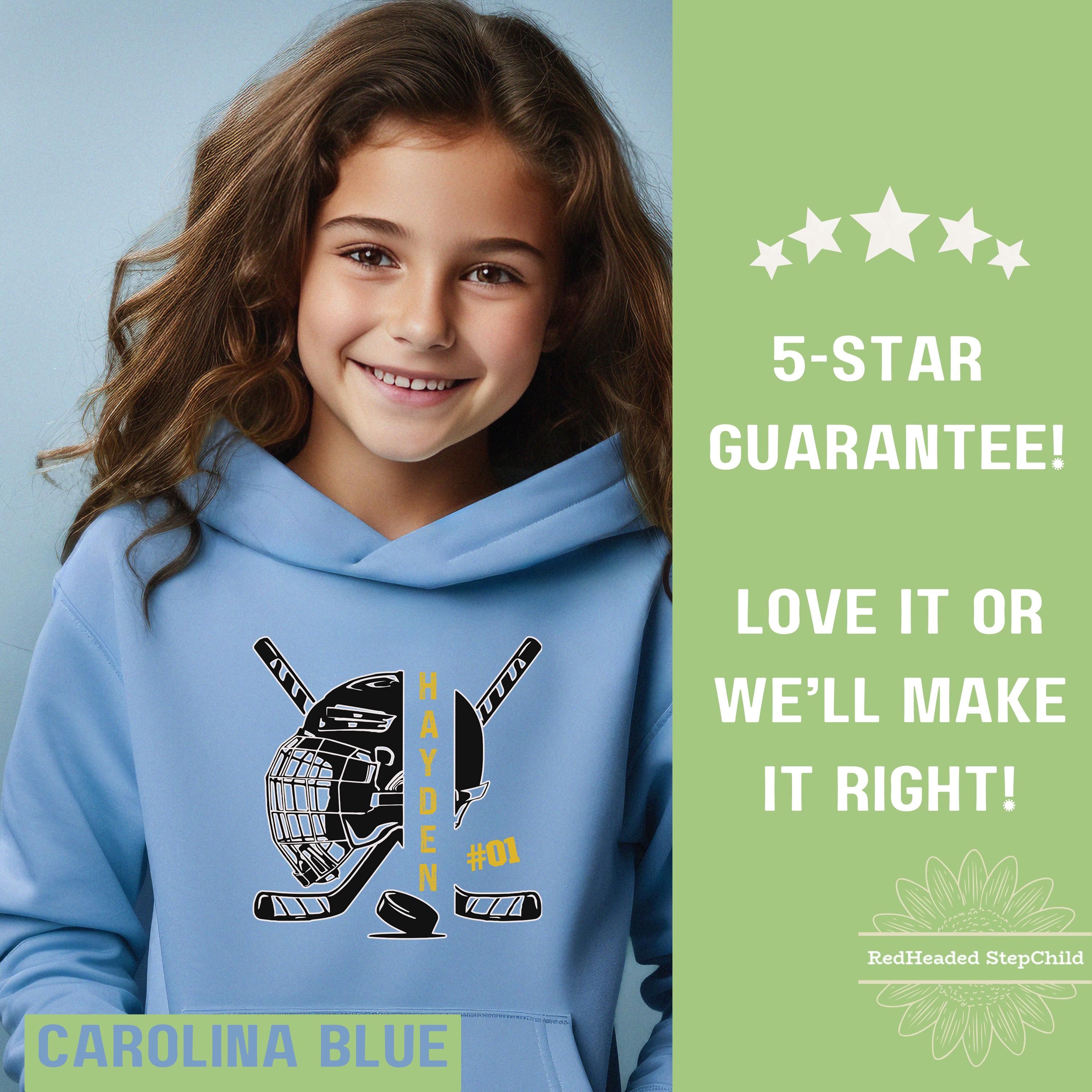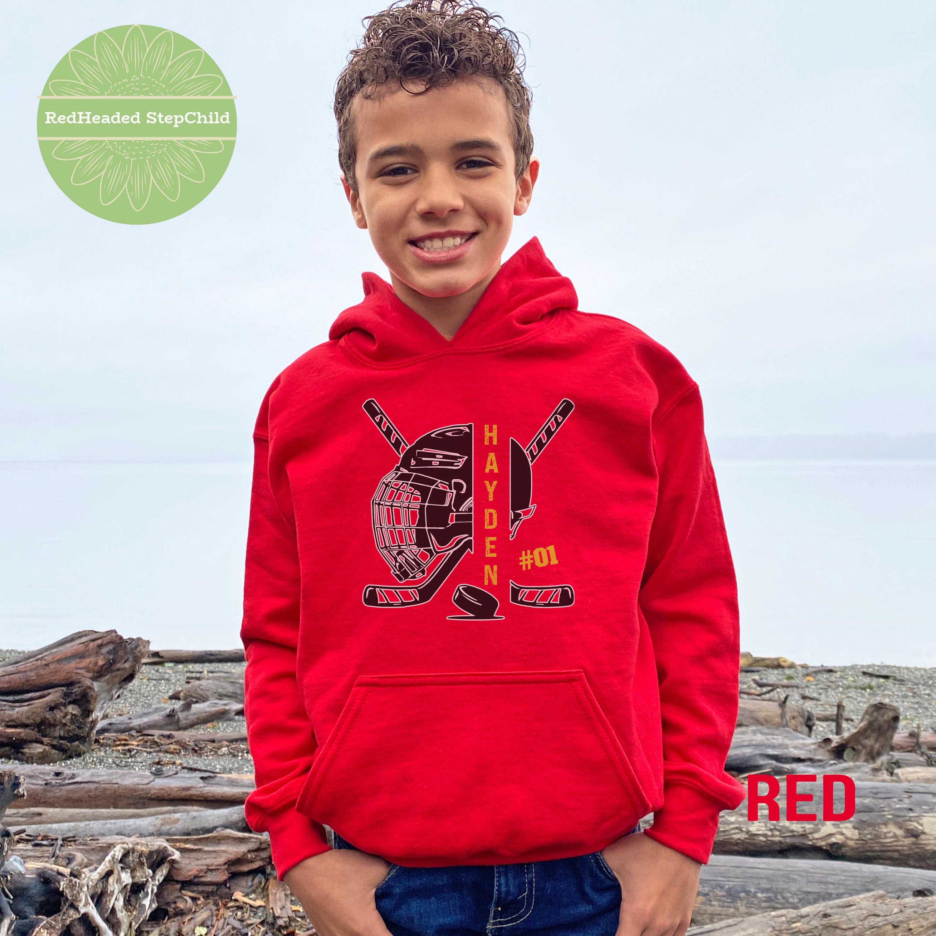 Show your hockey team spirit with a personalized hockey hoodie or sweatshirt. Customize the front name and number. Available in adult and youth size.