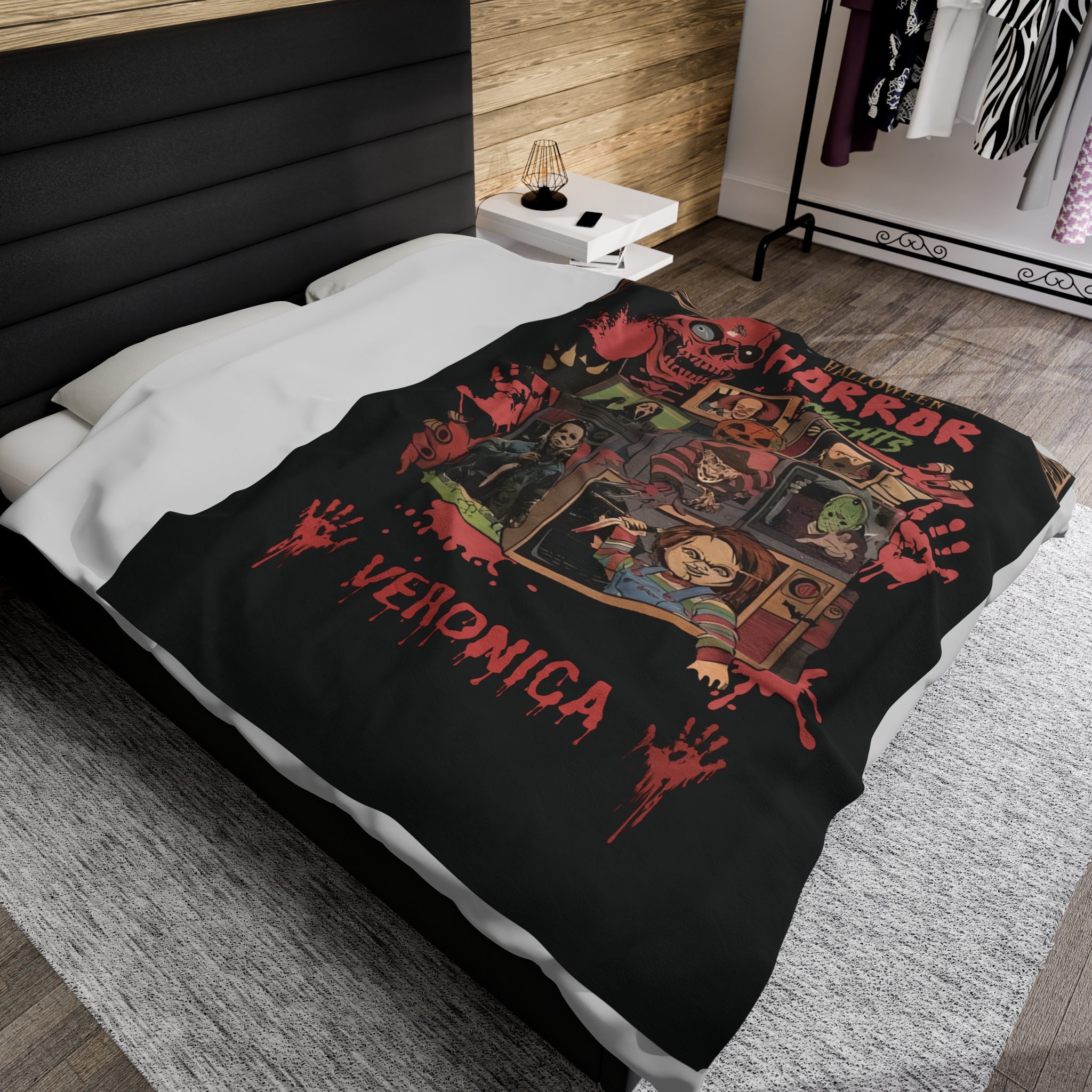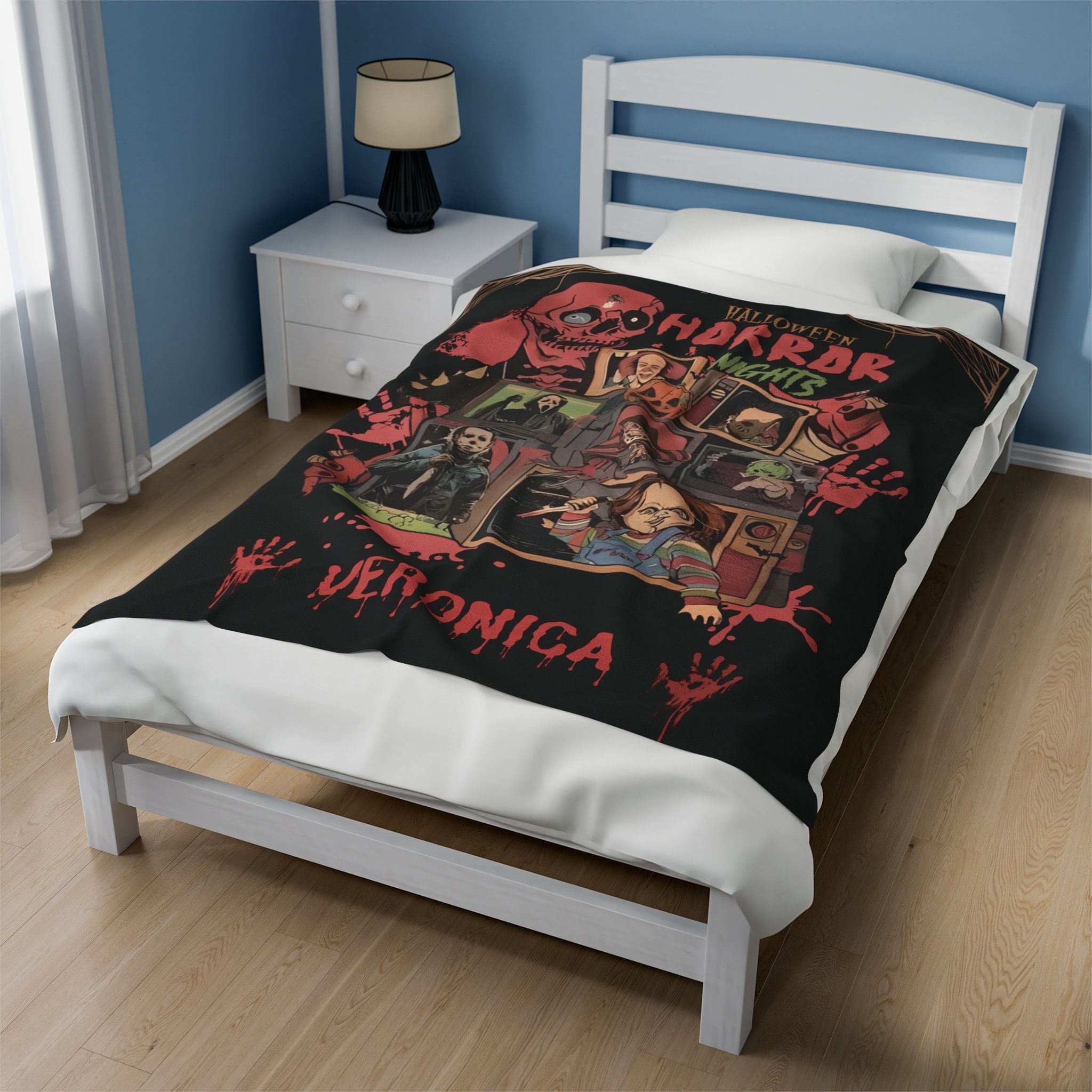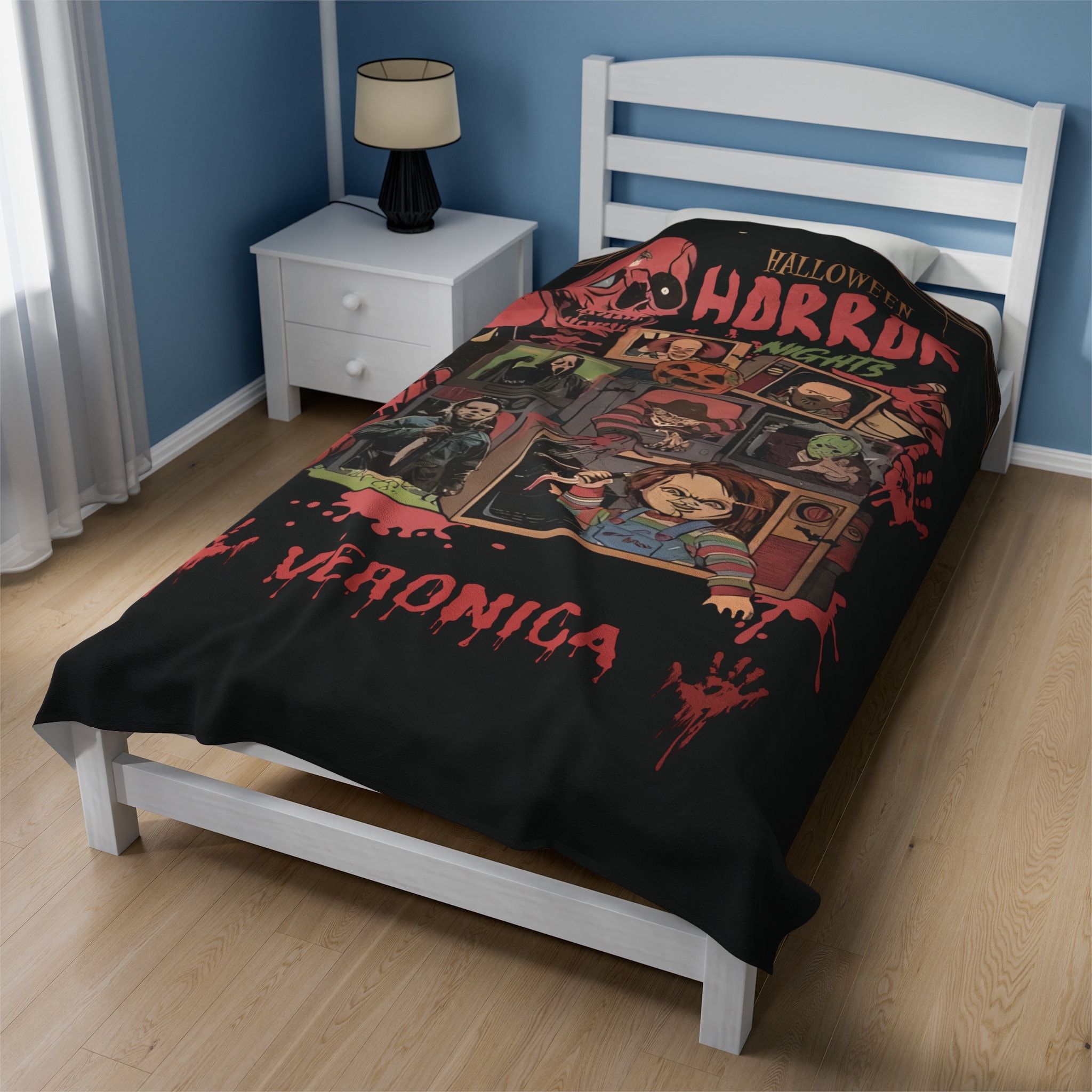 Embrace the darkness. Be safe in our horror movie blanket. Personalize your horror blanket with your name and put on your spookiest scary movie. This is made for the horror movie lover and those who need something to survive a scary movie night. Perfect for hiding behind for safety.