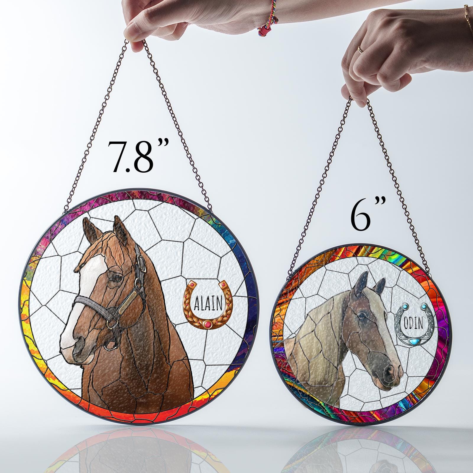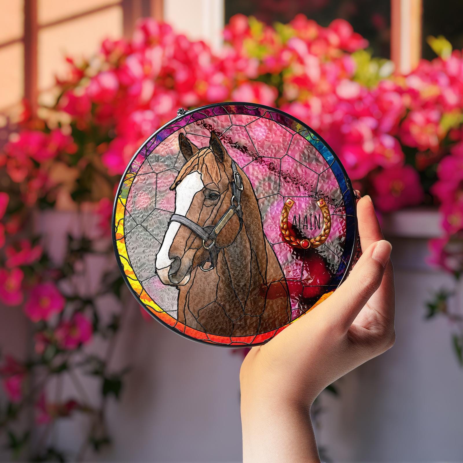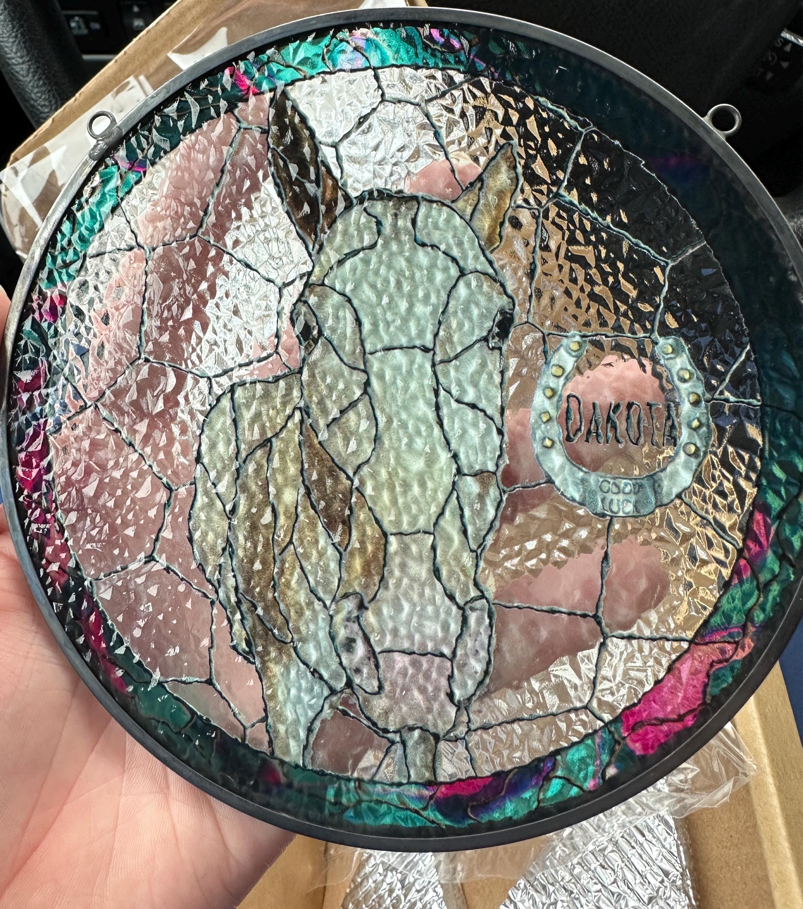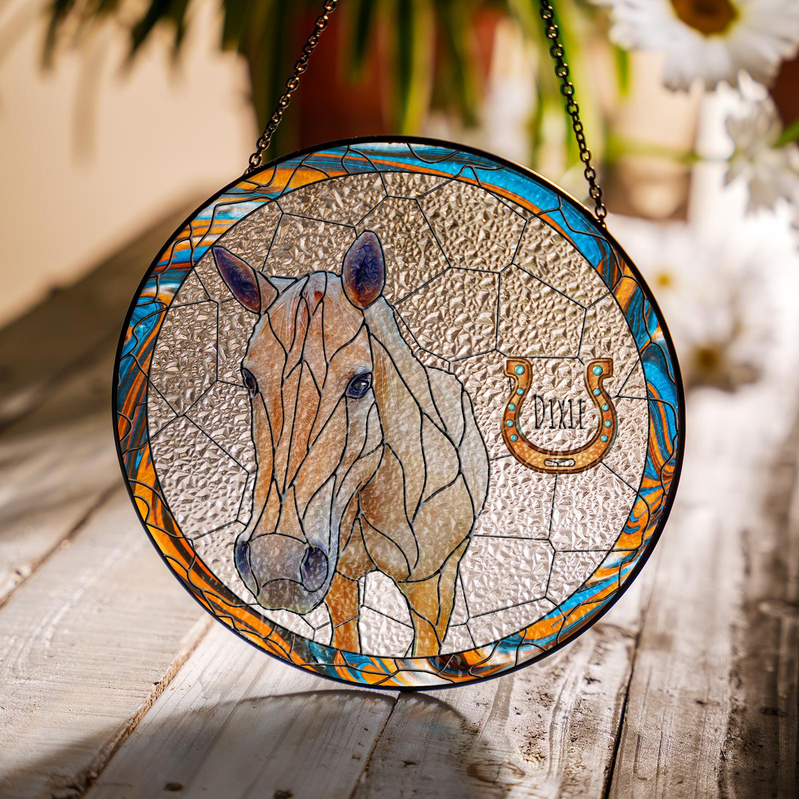 Custom Portrait Design: Personalize the suncatcher with a portrait of your horse, capturing their unique spirit and beauty in a vibrant stained glass format.