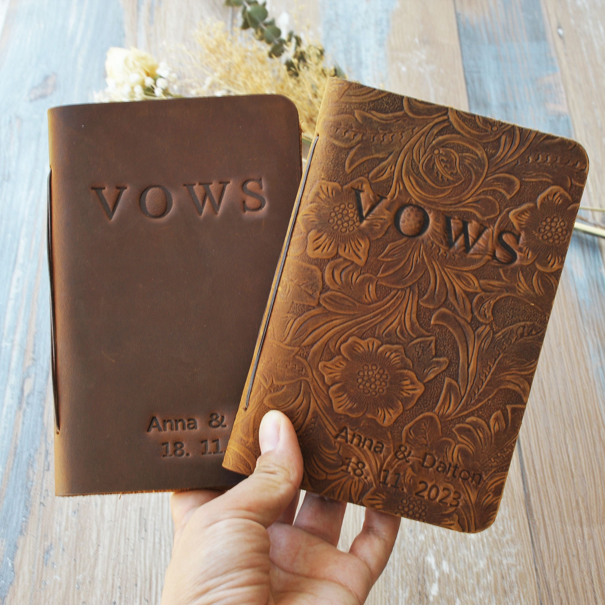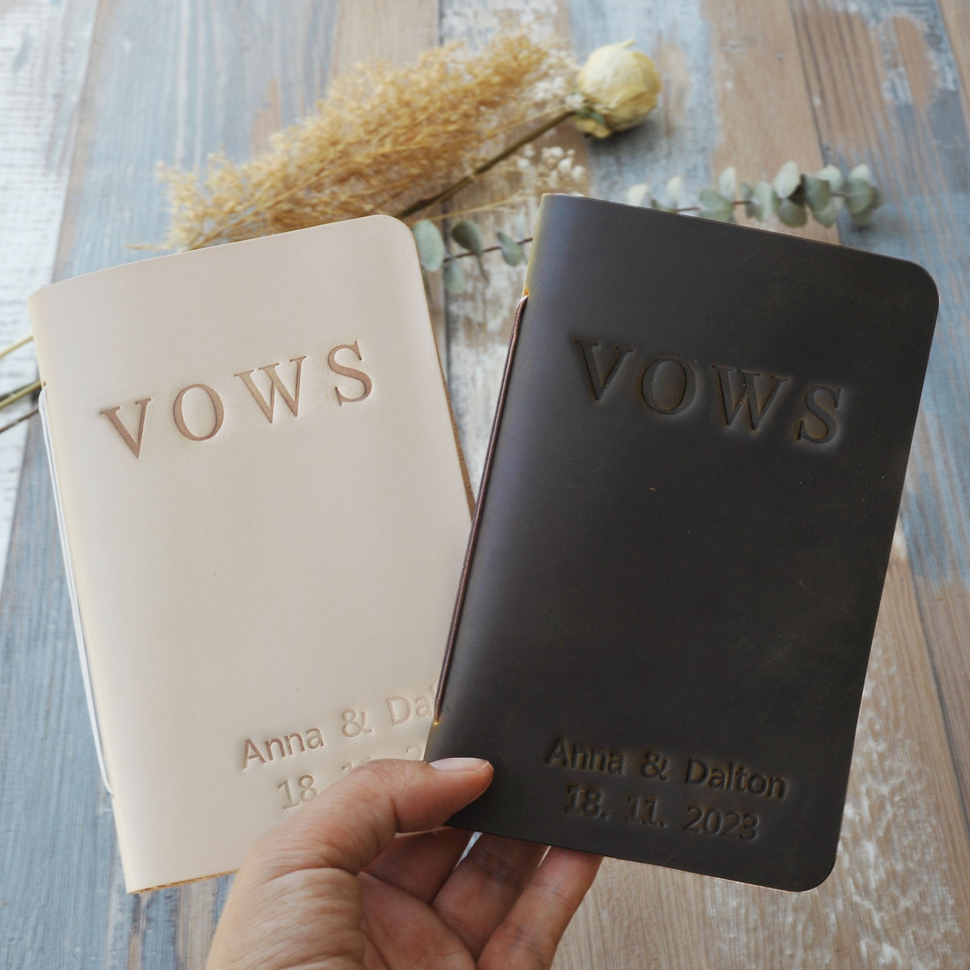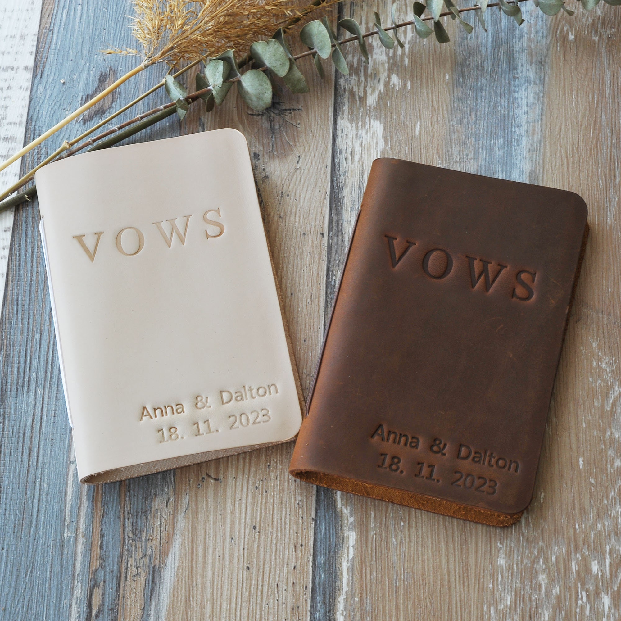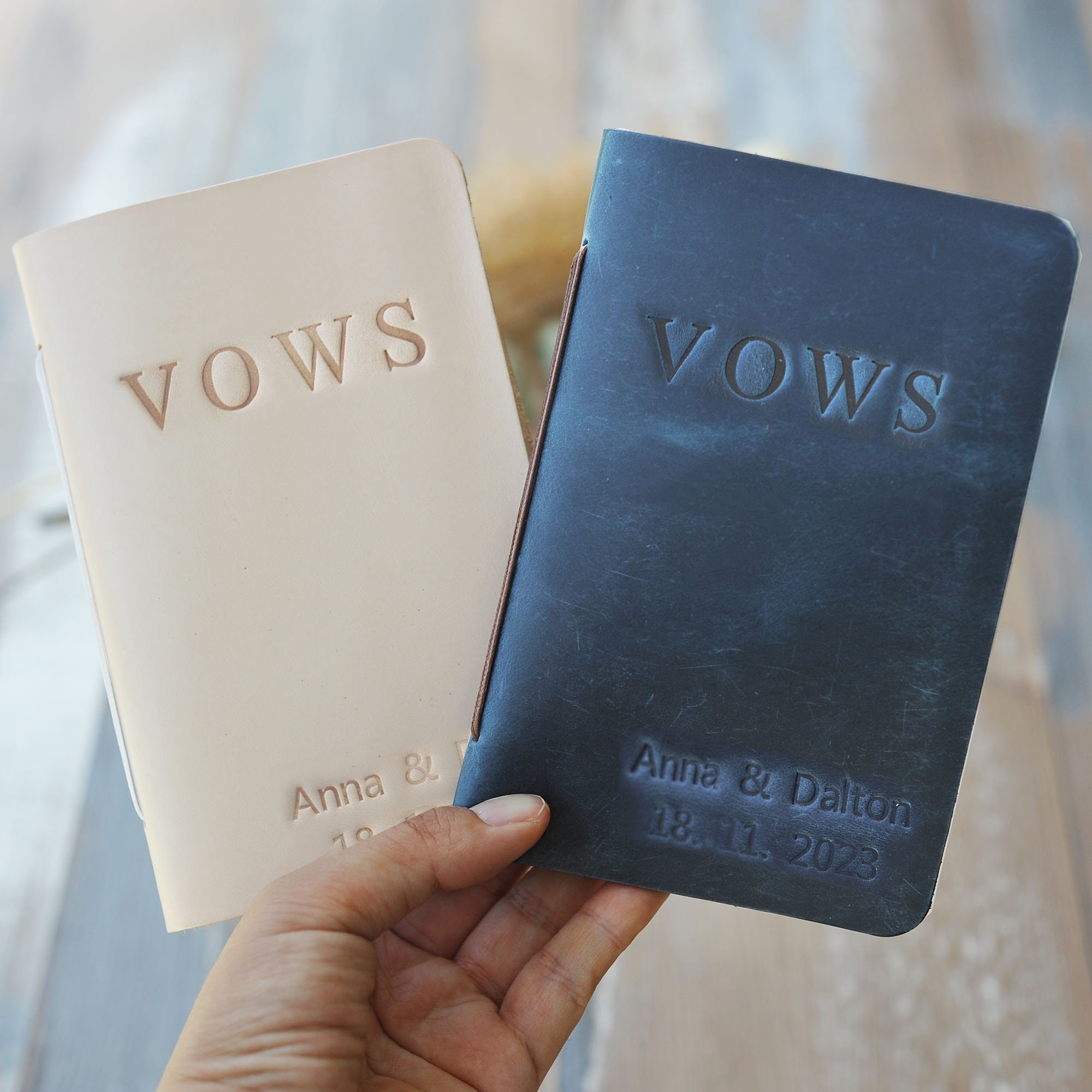 This customizable leather vow book is made from premium, full-grain leather and high quality acid free paper. You can personalize them with the names, date, texts and colors that you want. Customize for your wedding day, Also makes a great bridal shower gift for the couple!