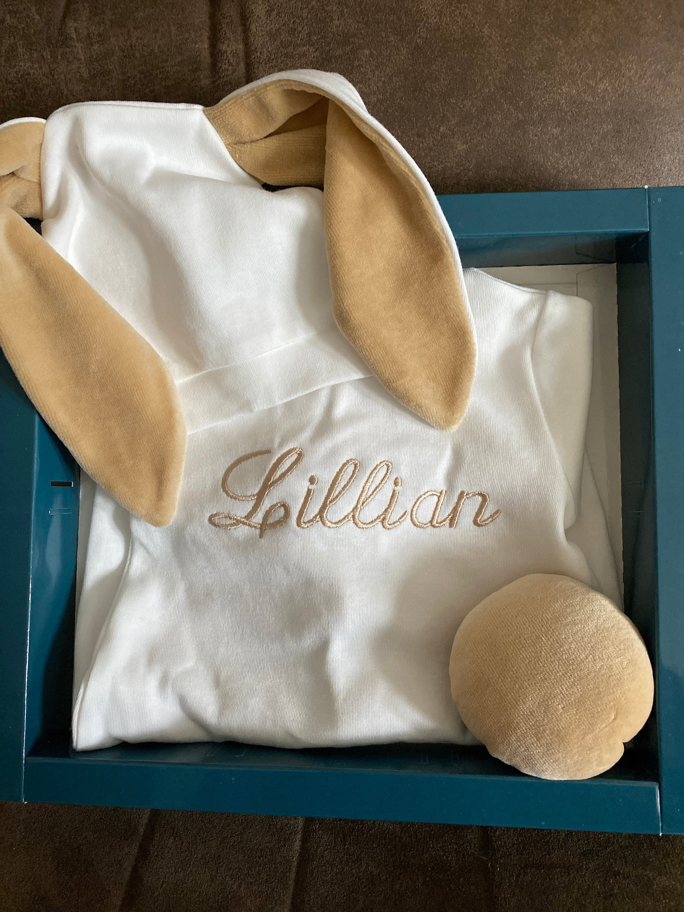 Embrace the joy of personalization by adding your desired name to this unique bunny costume, ensuring that every precious detail is tailored to your little one. Make the first moments at home truly special with this bespoke outfit that captures the essence of warmth and love. Welcome your bundle of joy in style with our exclusive Personalized Bunny Costume Romper — a cherished keepsake for a lifetime of memories.