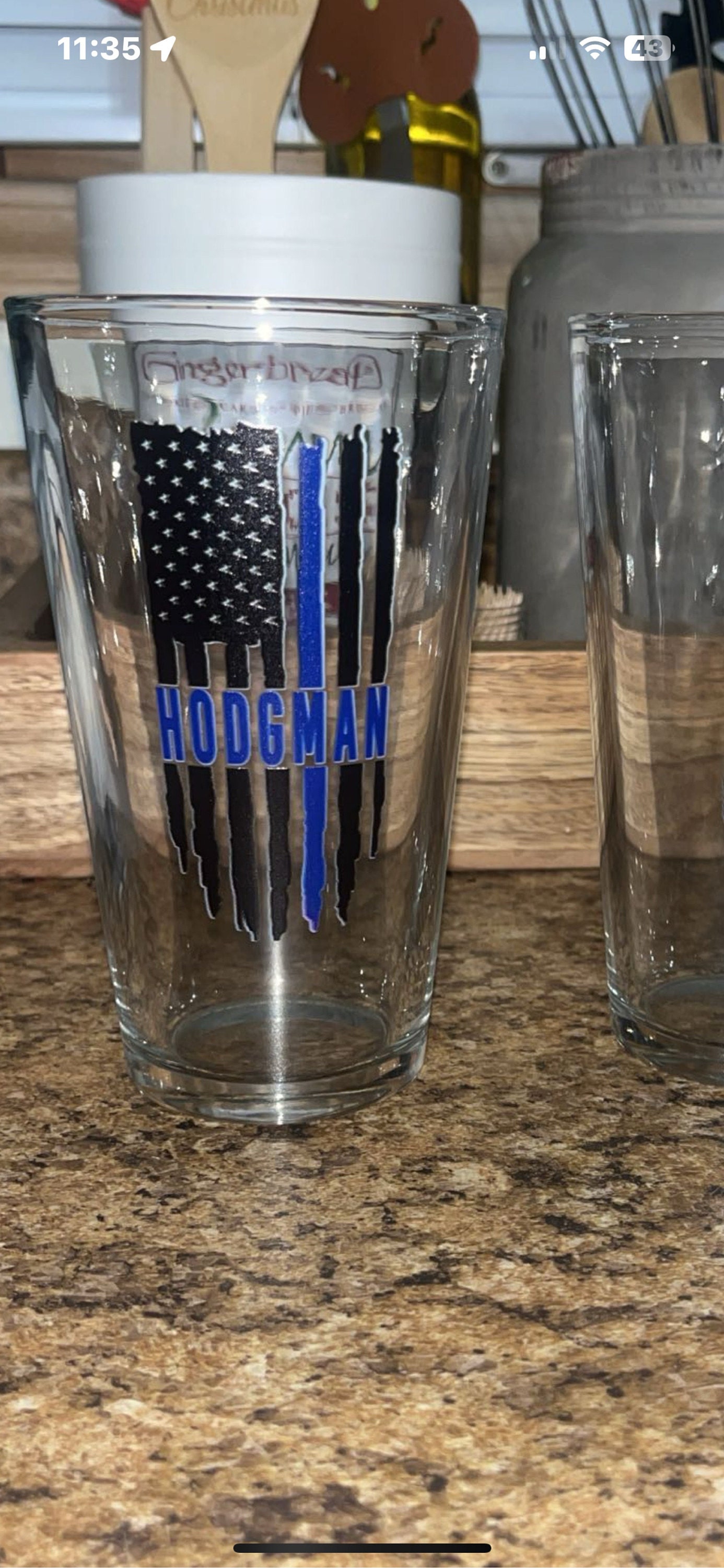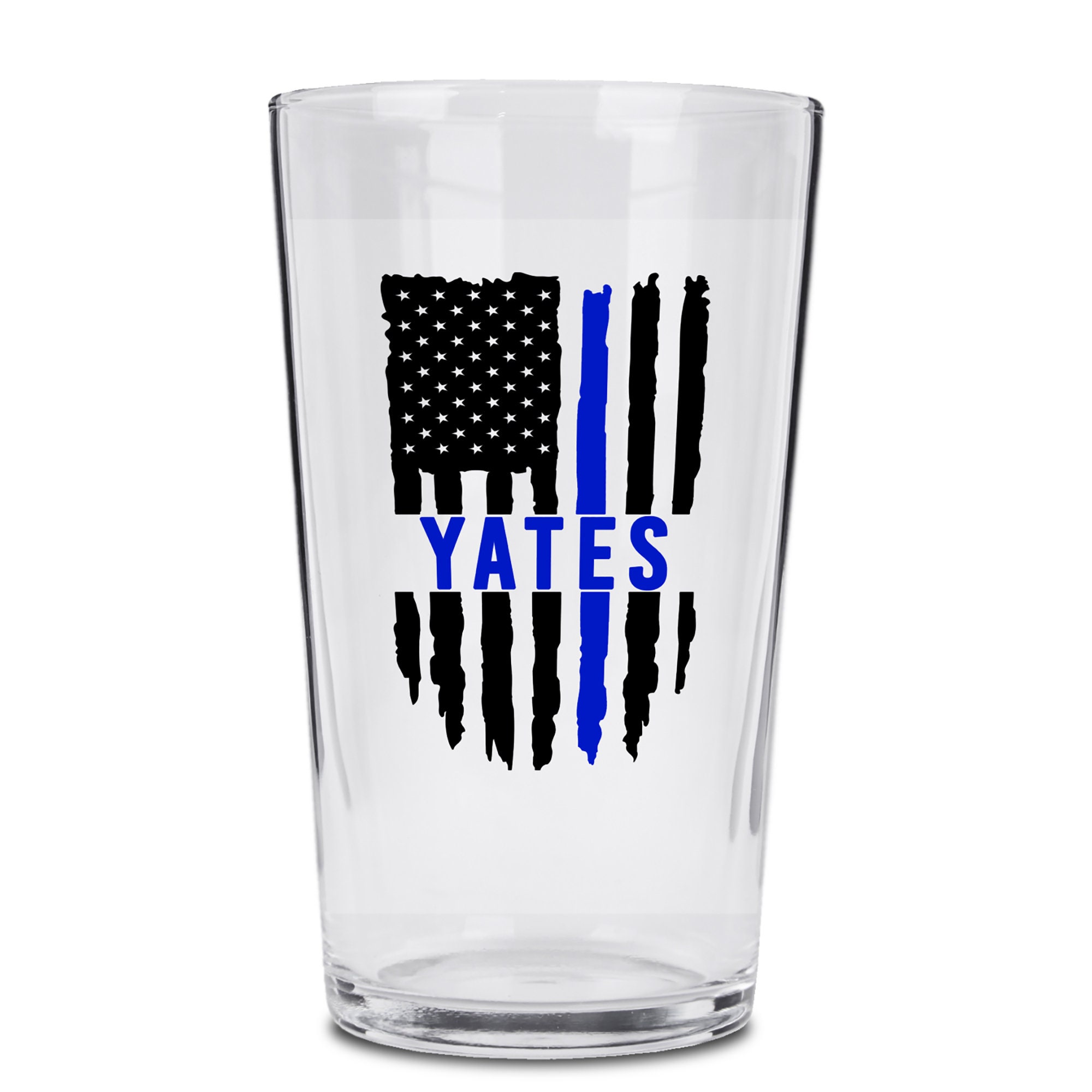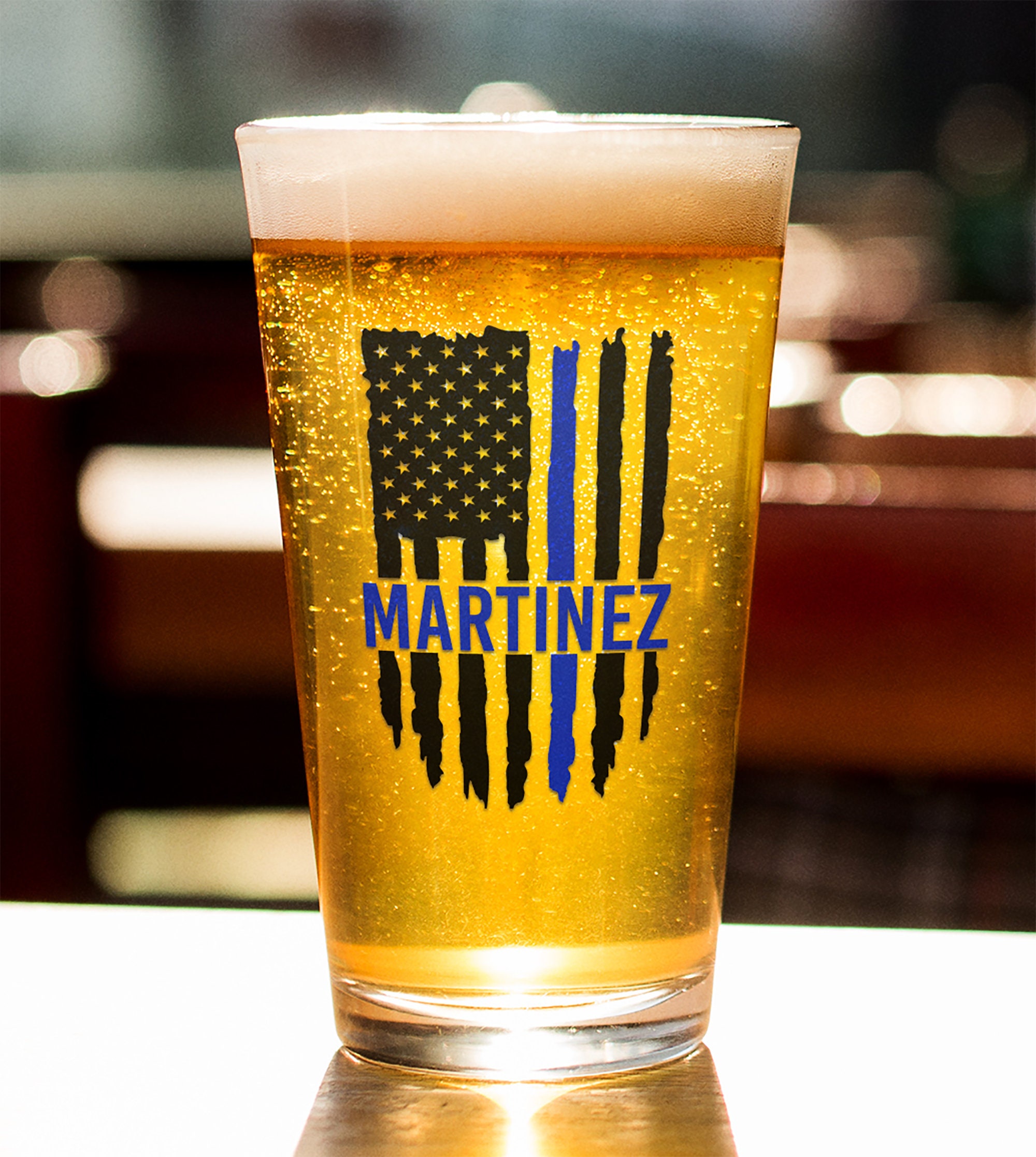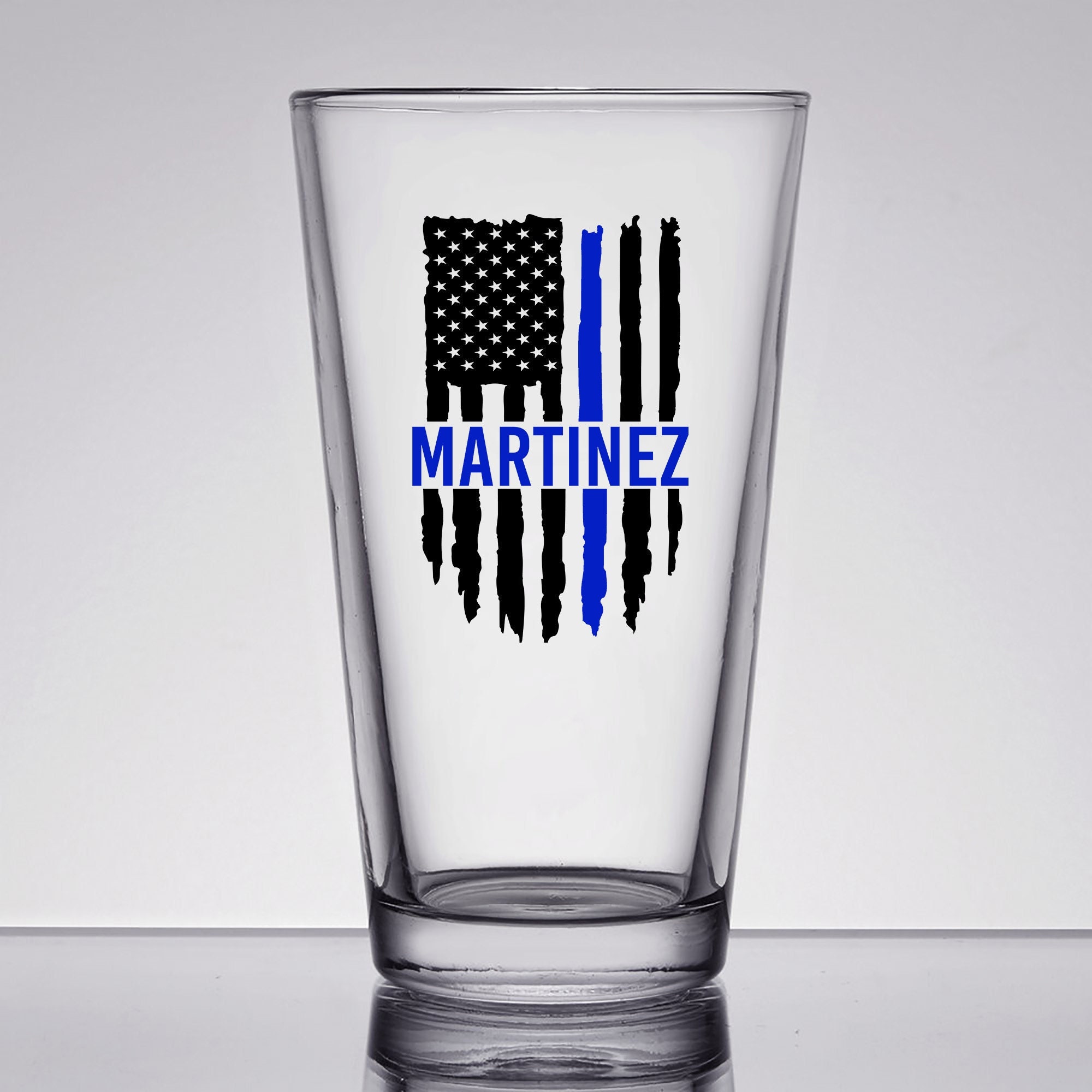 - This beer glass pint features a police-themed design with a Thin Blue Line flag print.