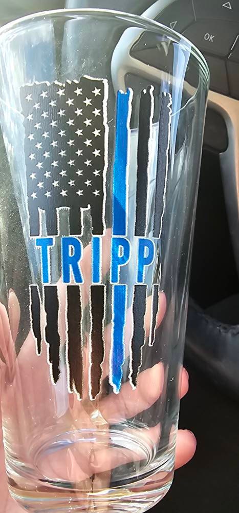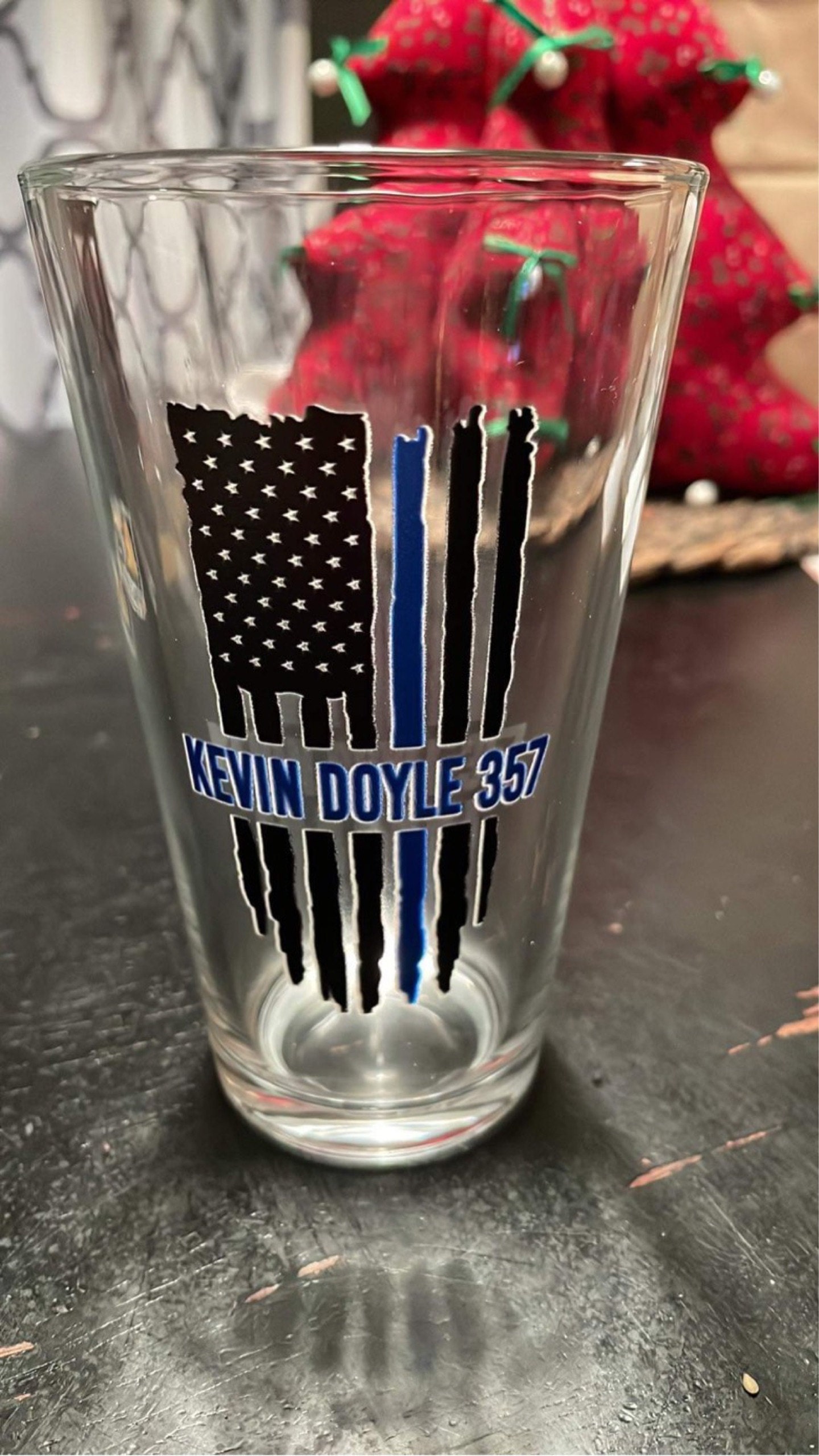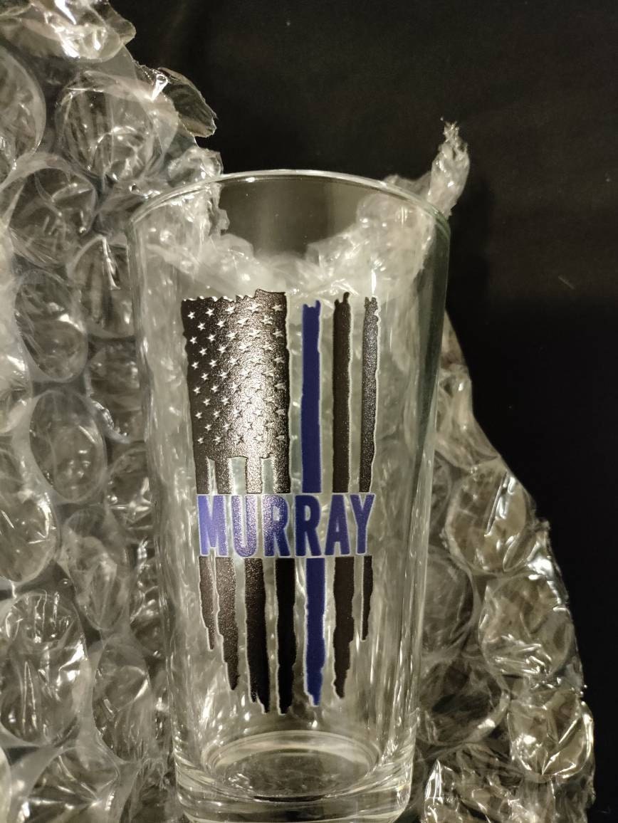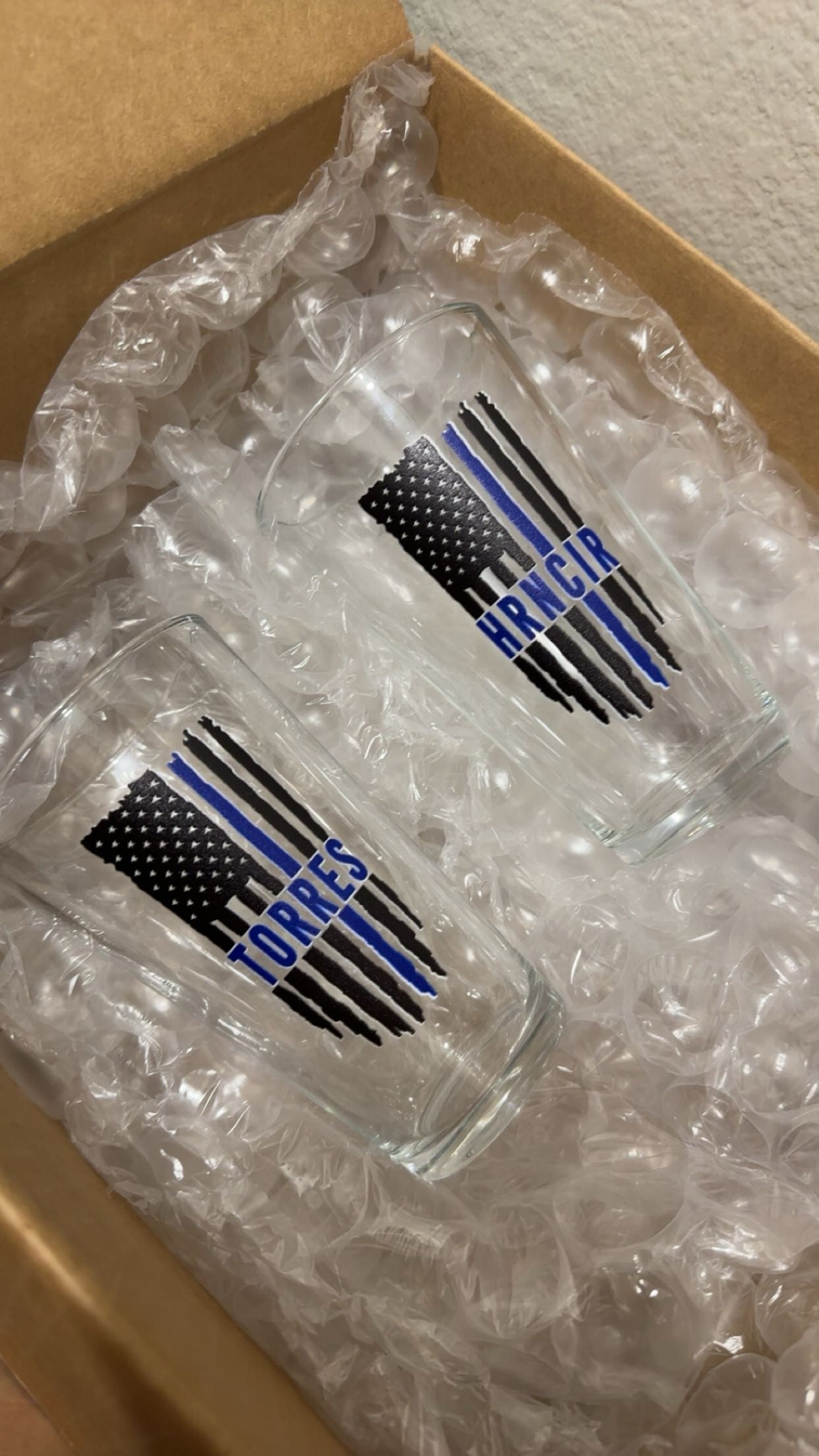 - This beer glass pint features a police-themed design with a Thin Blue Line flag print.