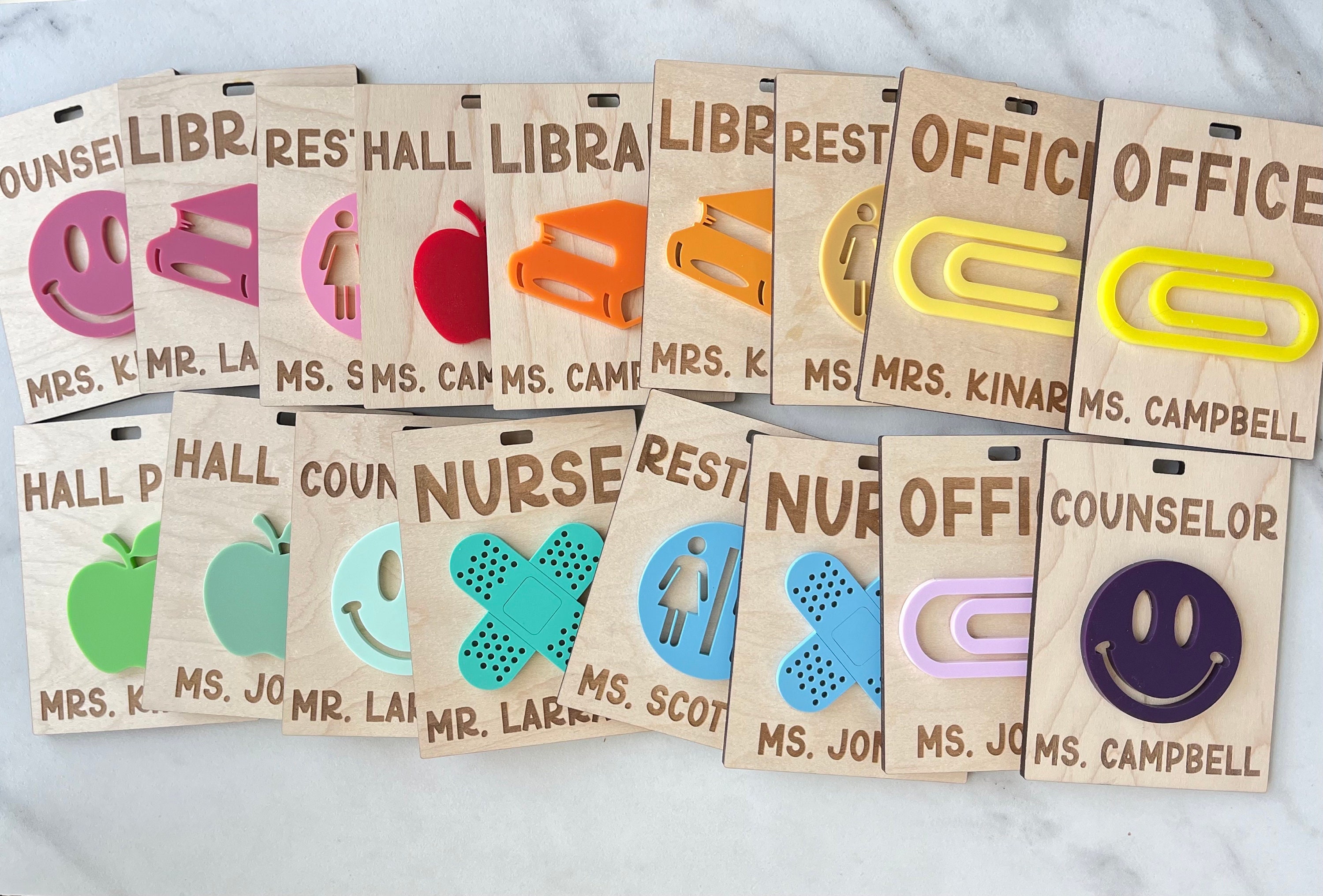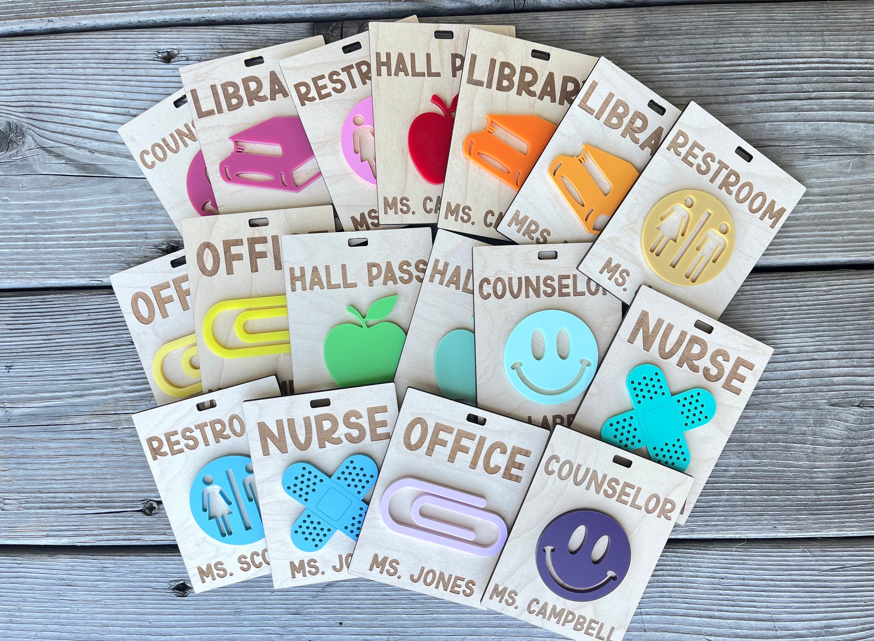 These custom hall passes are made from 1/8 inch thick maple wood and are layered with 1/8 inch thick laser cut acrylic. Text is engraved.