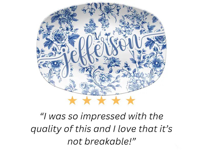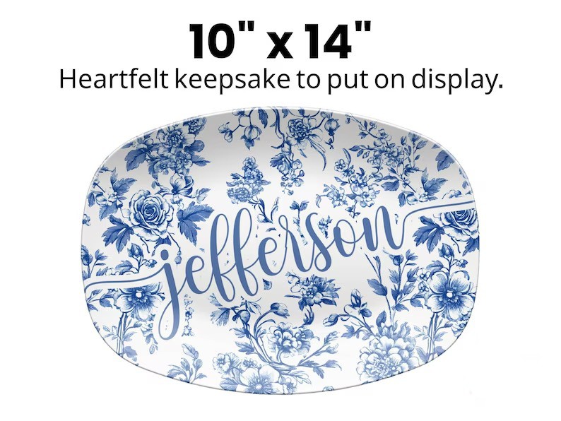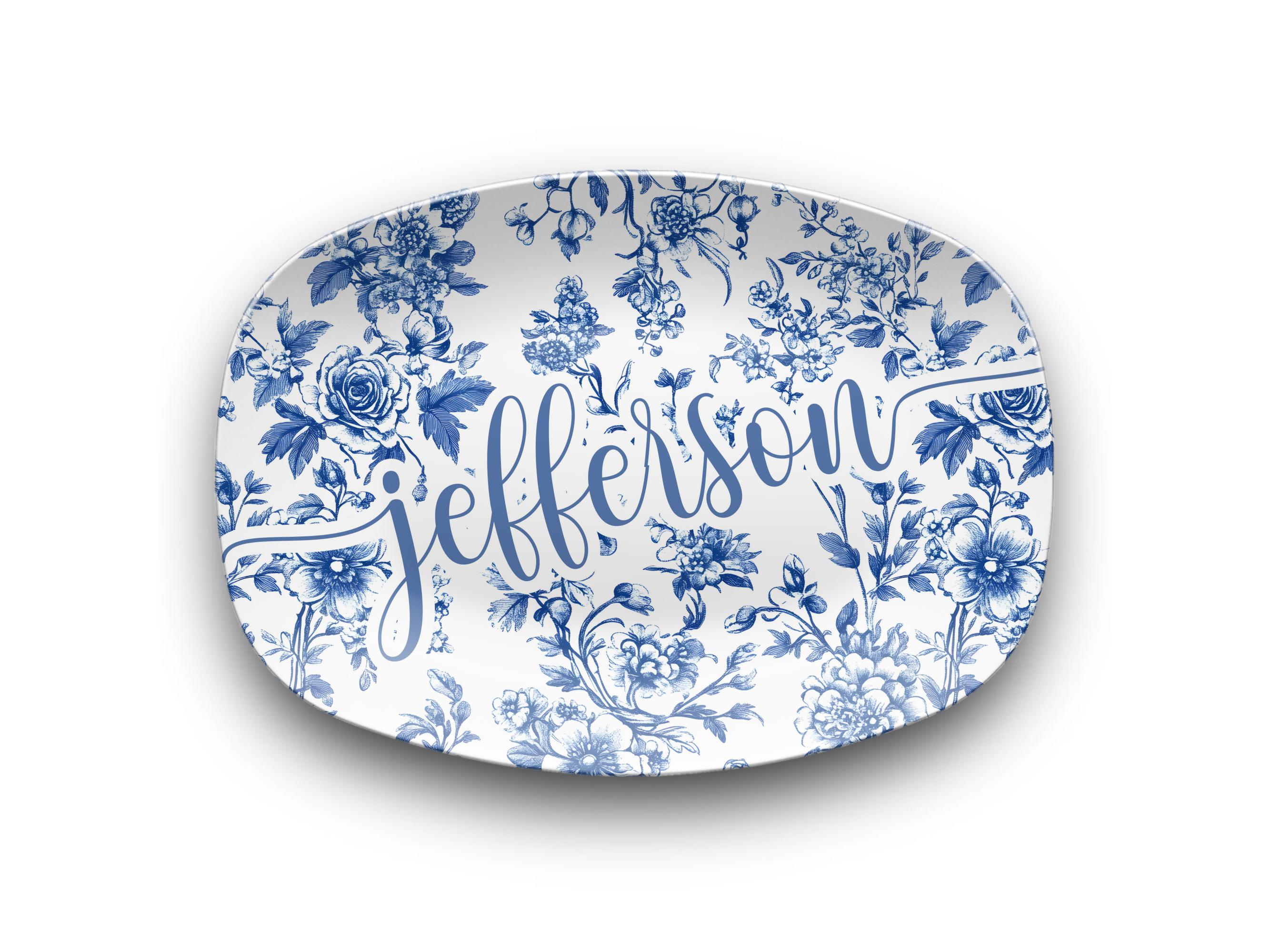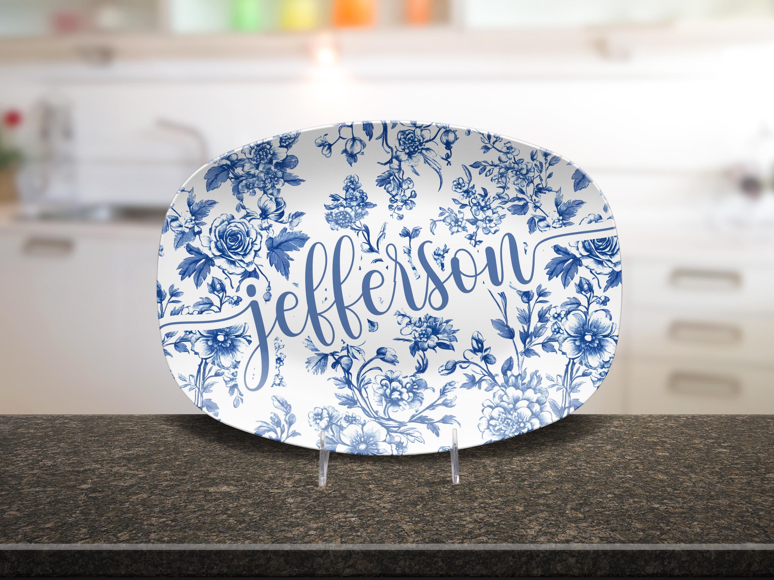 Elevate your tableware with our Personalized Toile de Jouy Platter, featuring a timeless blue floral design and custom family name. Perfect as a wedding gift for newlyweds, an anniversary keepsake, or a charming addition to your French country home decor. This elegant platter blends classic toile patterns with modern personalization, making it a thoughtful gift for couples, families, or housewarming celebrations.