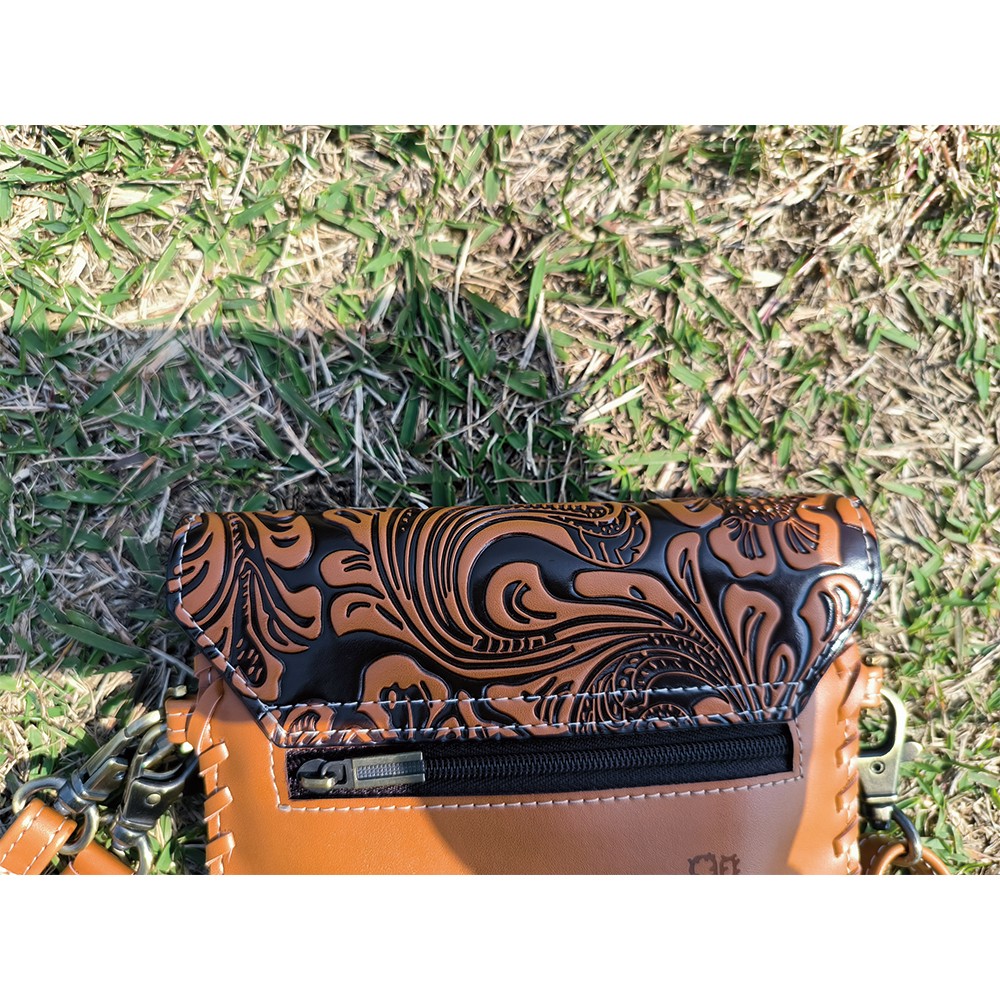 • tooled leather flap
