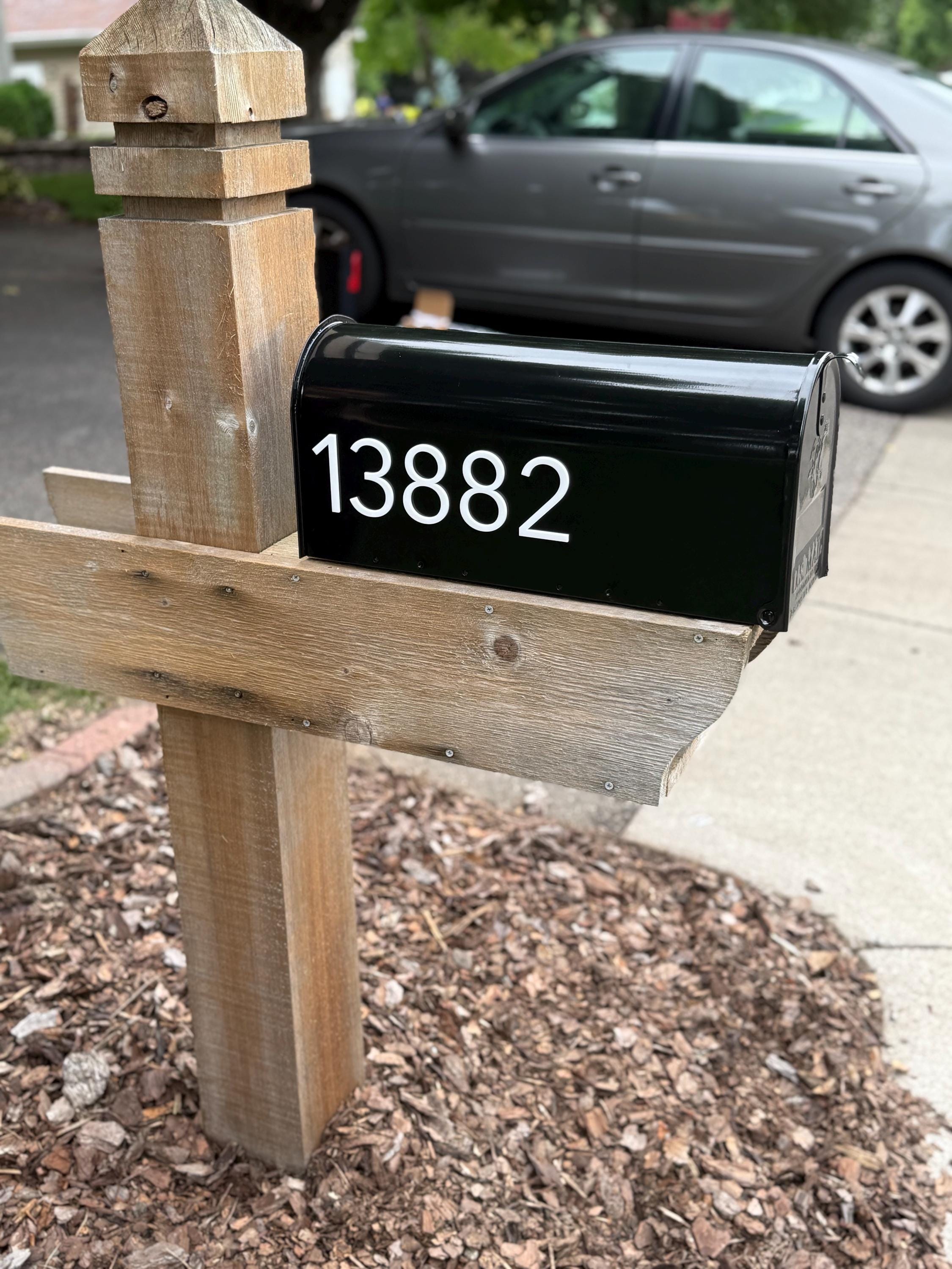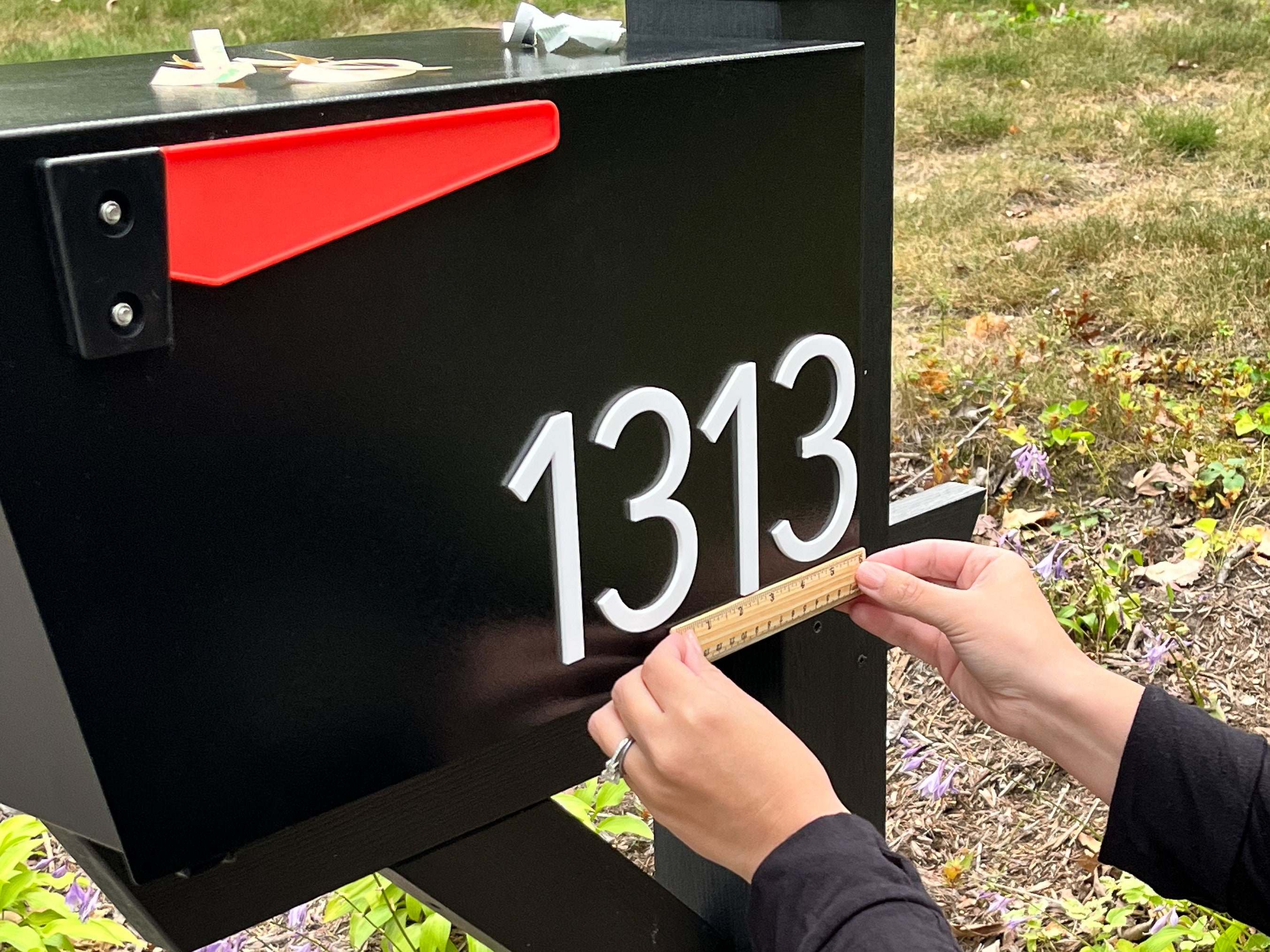 - Wood ruler with sticky dots on the back so you can set on mailbox while you are placing the numbers straight and remove afterwards