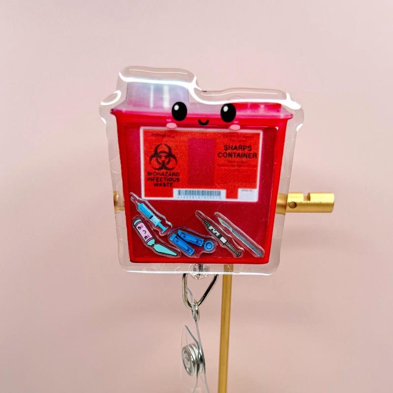 Perfect for phlebotomists, lab techs, nurses, or any healthcare professional who handles needles, this unique design features a mini sharps container filled with fun little shaker pieces inside. It’s a lighthearted way to show off your personality while keeping your ID badge secure and accessible throughout your shift.