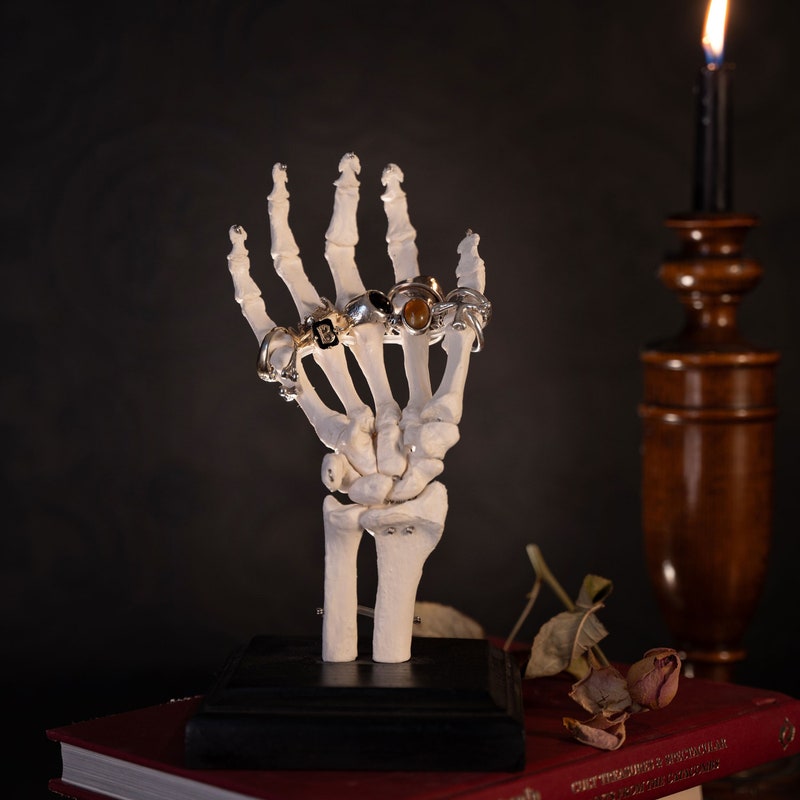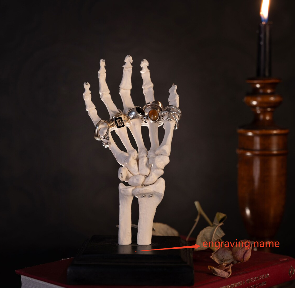 The sturdy skeleton hand is made from resin. The fingers can be moved slightly to angle as desired to hold rings, necklaces etc.