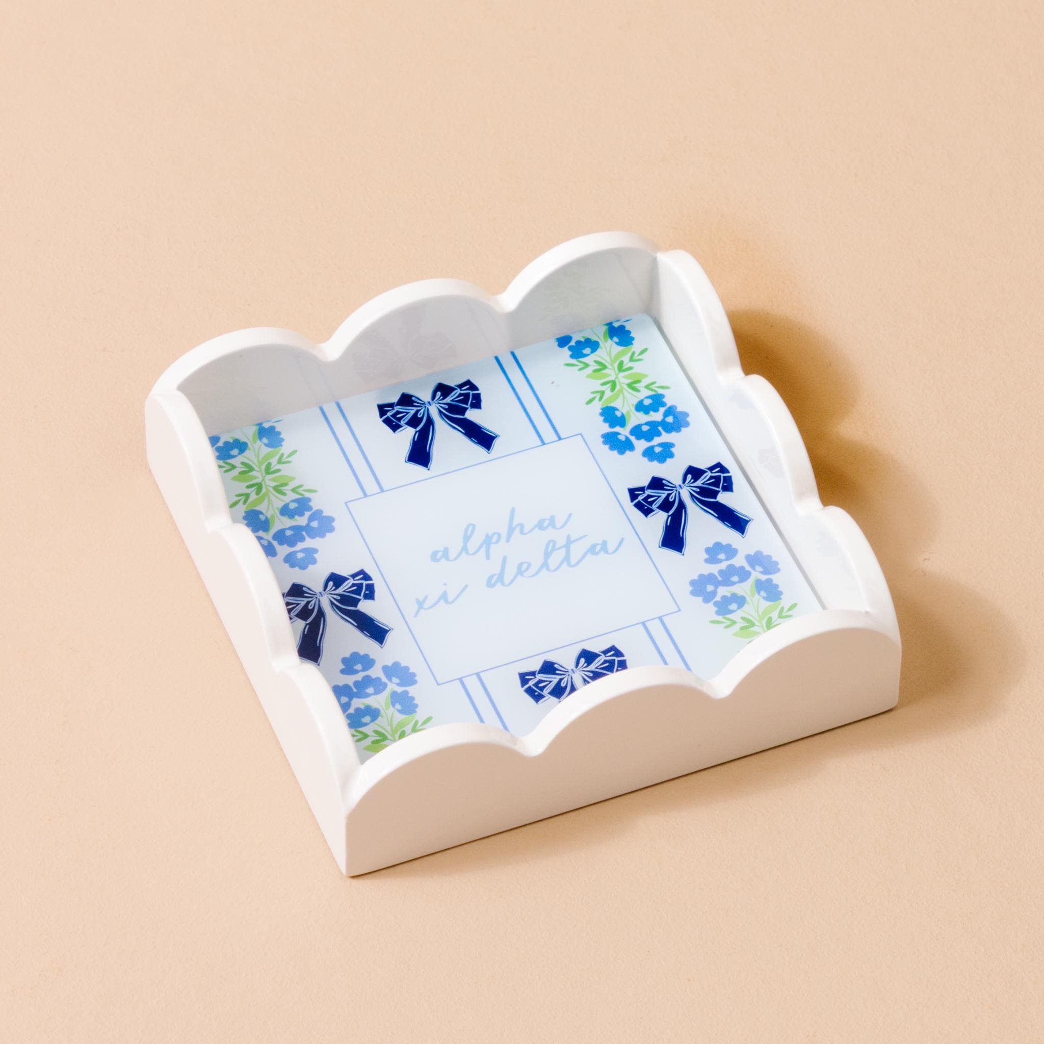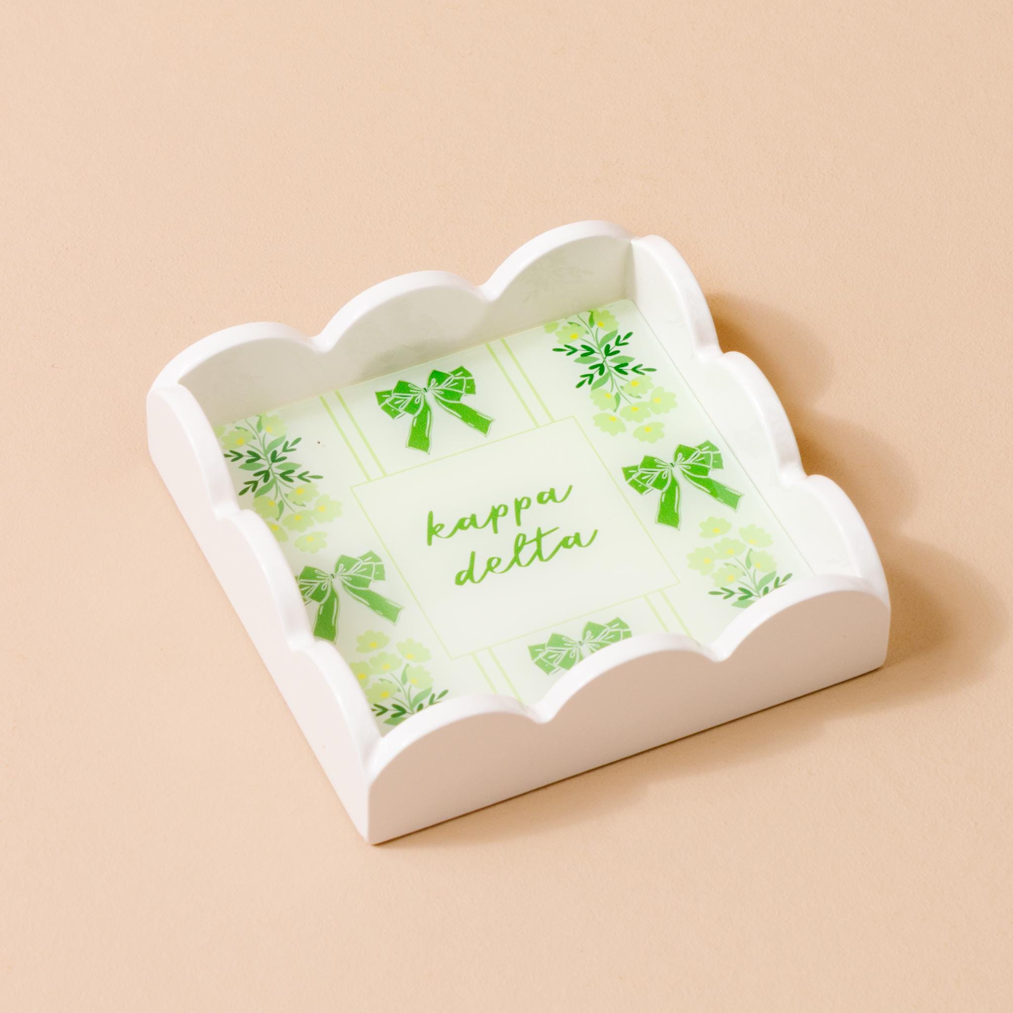 Rep your sorority in style with our Scallop Trinket Tray! This officially licensed dish is the perfect way to organize your jewelry while showing off your chapter pride. Featuring your sorority’s name and a darling scalloped rim, it adds a cute and functional touch to your vanity, dresser, or nightstand. Keep your rings, earrings, and everyday accessories neatly tucked away—with a little extra Greek flair.