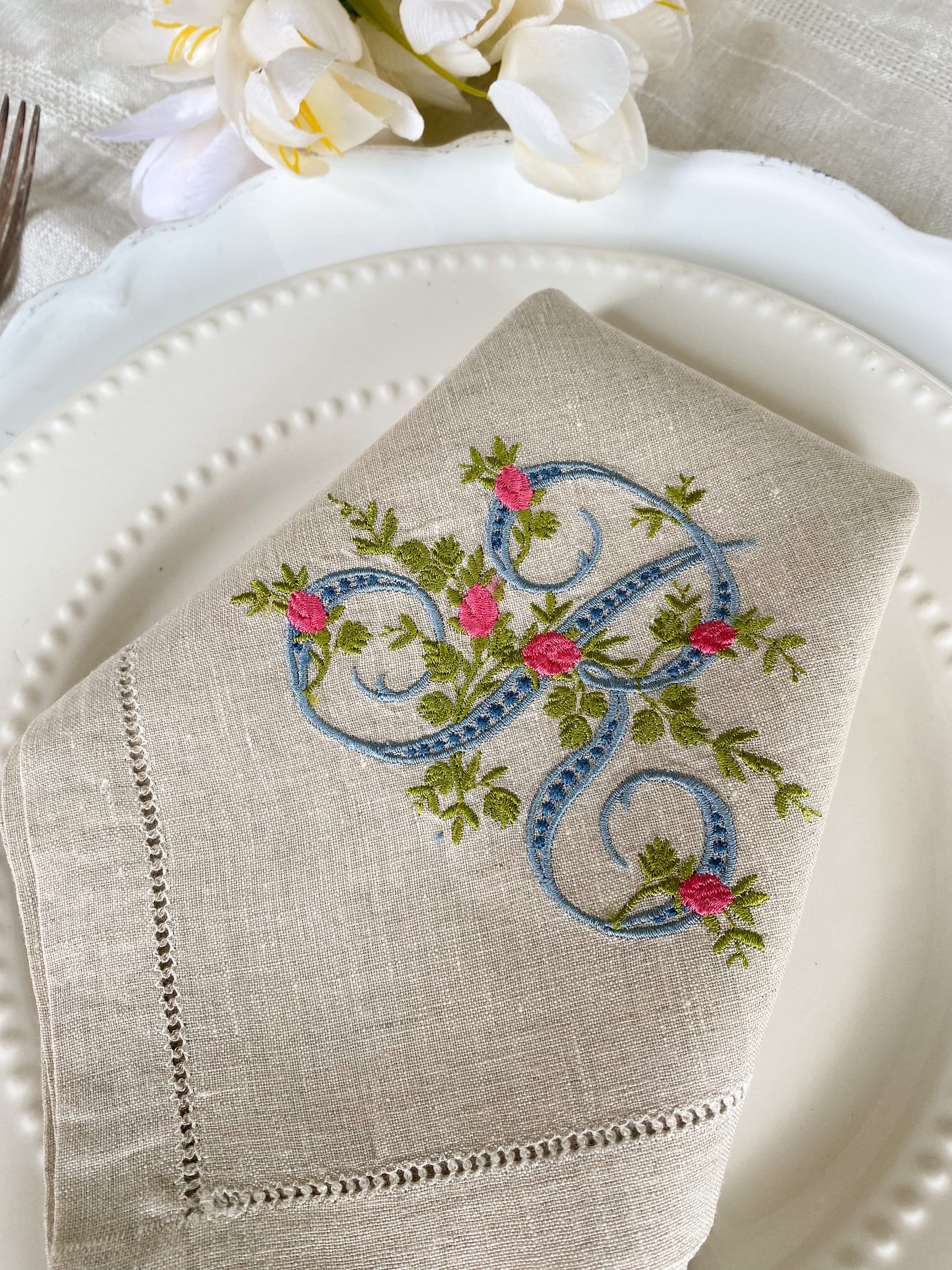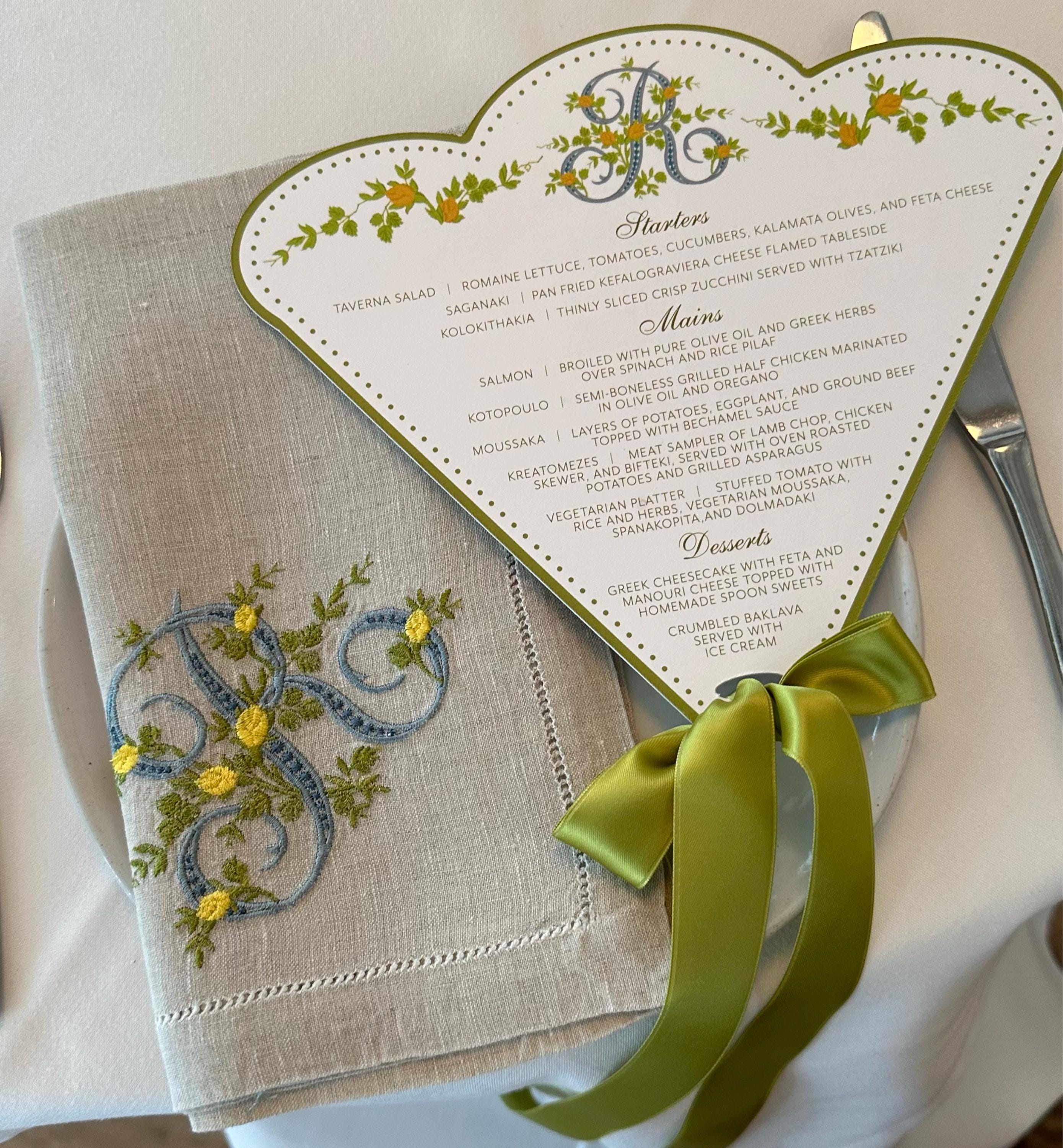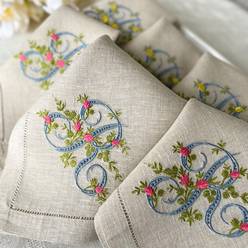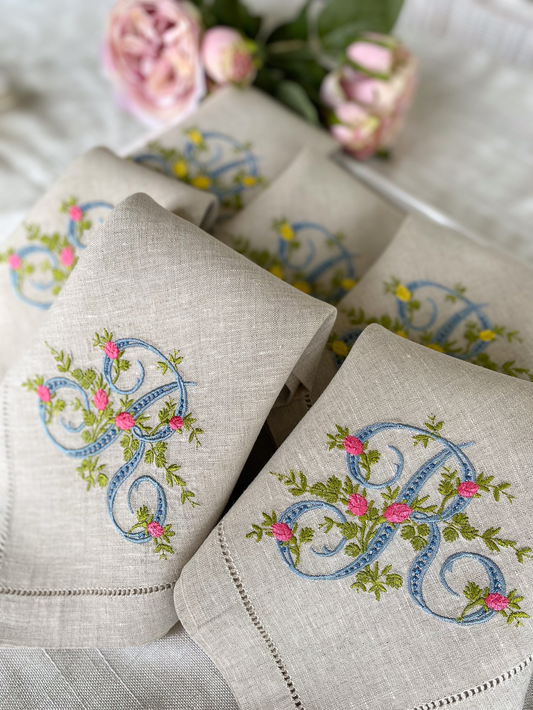 A single initial can represent either the first or last name. They are great option for either guest towels or napkins. Note that when choosing to embroider the initial of a first name, the embroidered garment would be considered less formal (for example a guest towel embroidered with “M” of Mary), vs. a set of napkins embroidered with the “S” of Smith—a last name representing the household.