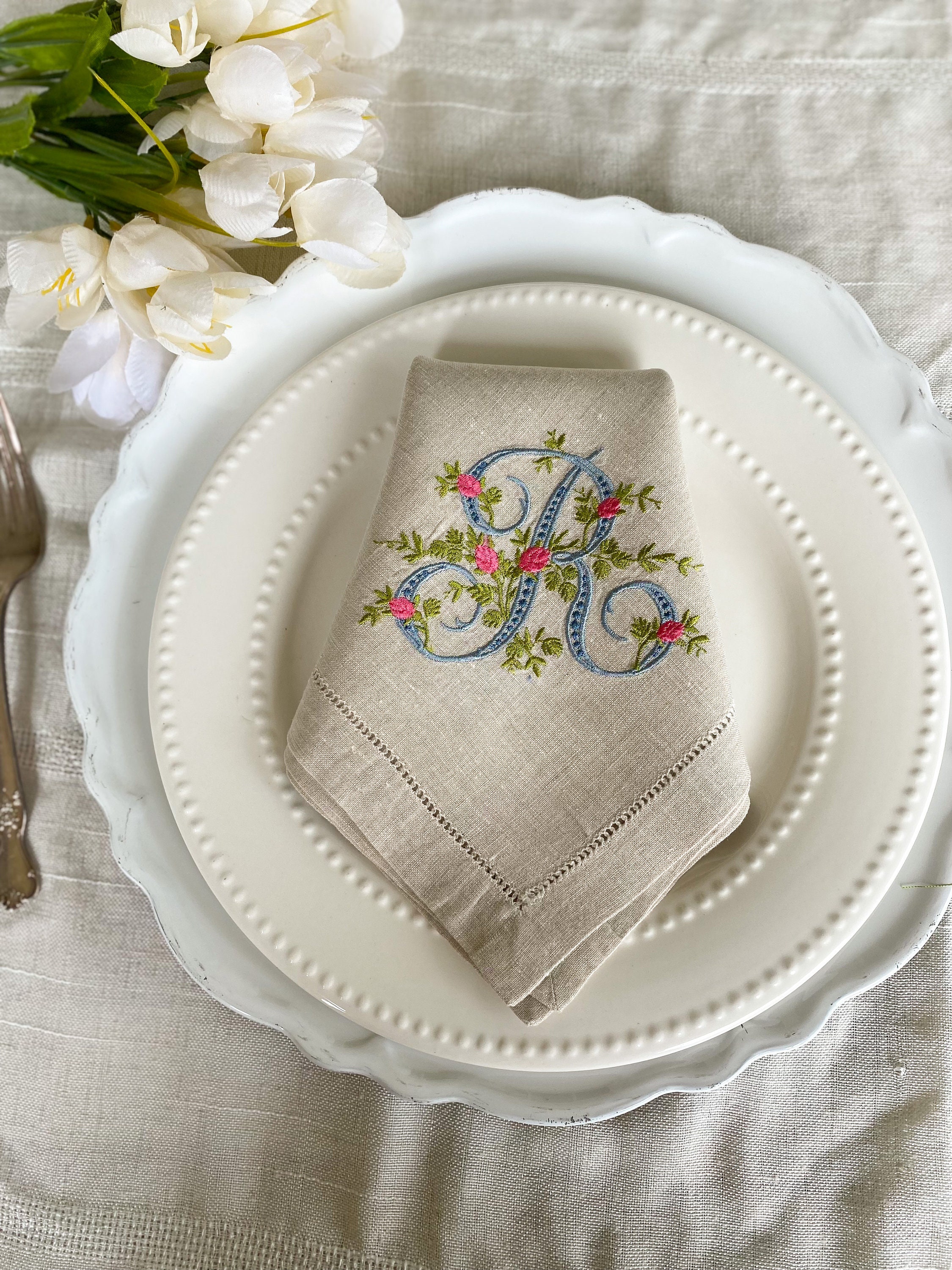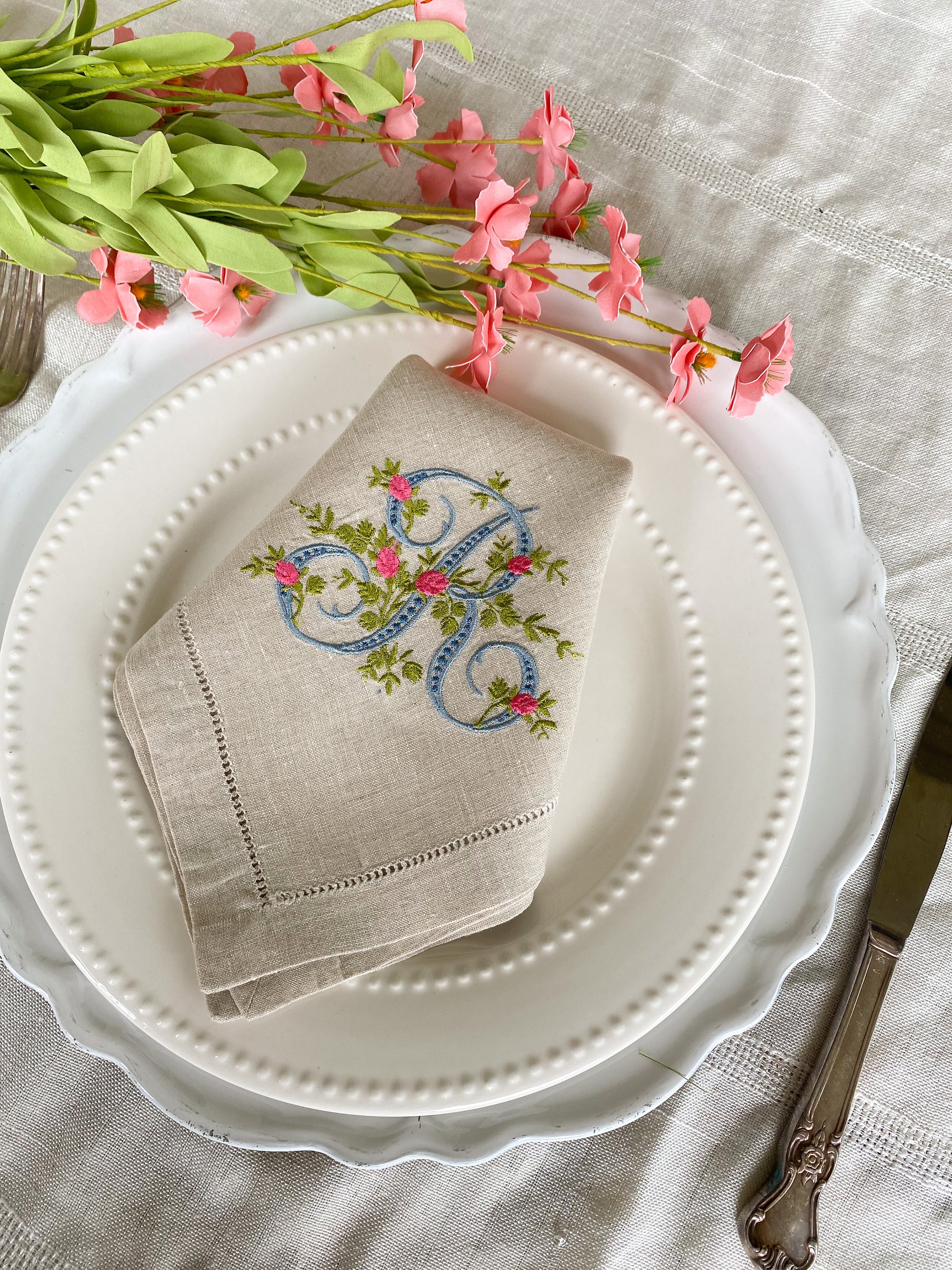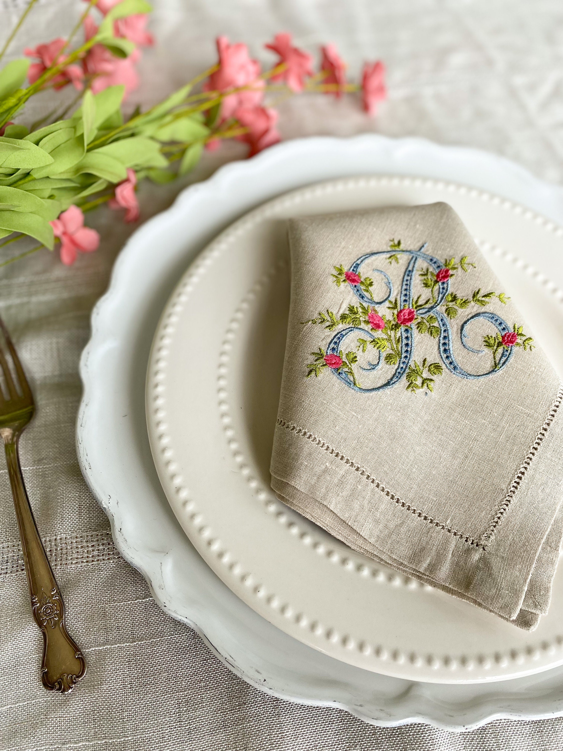 Linen care: Delicate wash, tumble dry in low heat. Linen cloth will shrink for about 5 percent after the first washing. Iron the napkin while still damp in high heat (backside of monogram).