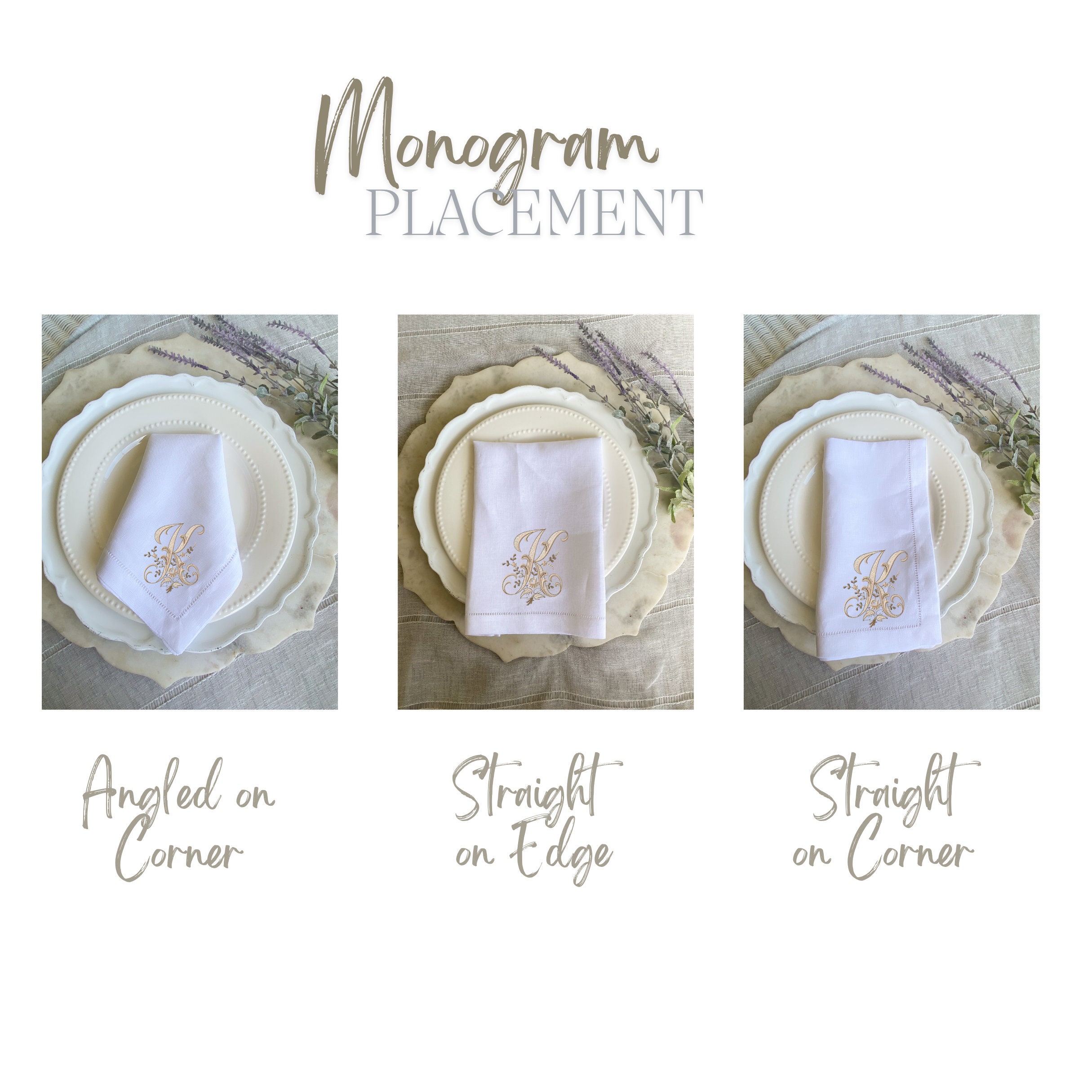 Take into account that, for monograms in napkins or guest towels, it all depends on the design and who will be using the linens. A set of dinner formal napkins to be used by a married couple hosting in Thanksgiving will probably be a 3-letter monogram that includes both the spouses’ names and last name, compared to a lady’s brunch that will be hosted by a woman who will need to have something only with her initials whether she is married or not. You may also notice that depending on the design some of our linens will look better, for example, with a 3-letter monogram vs a 2-letter monogram so take that into consideration when personalizing them!