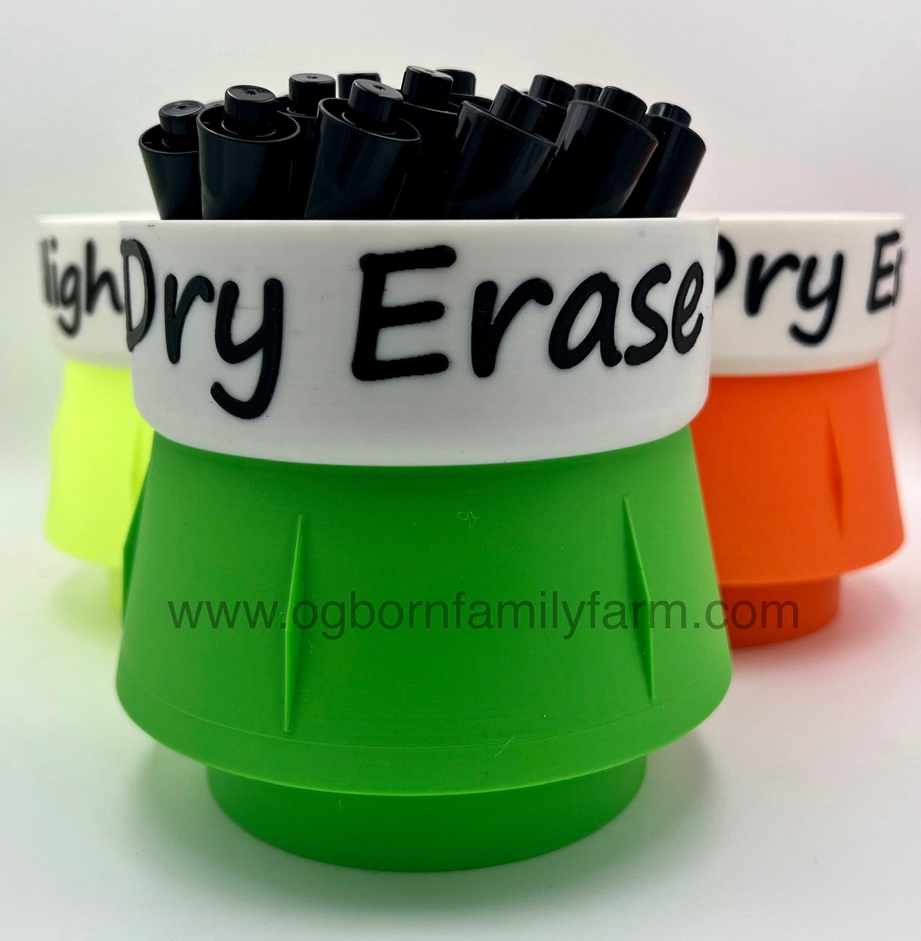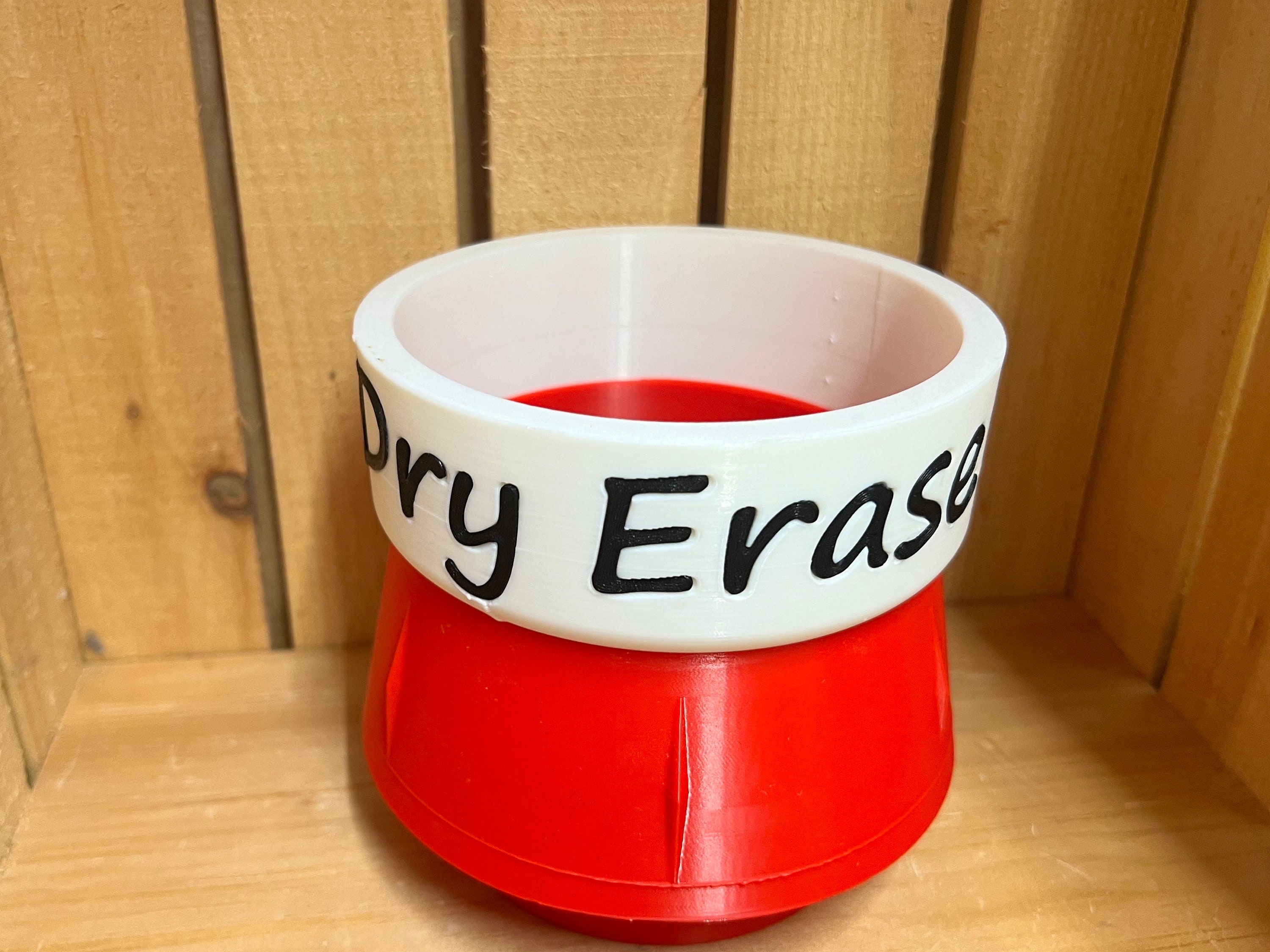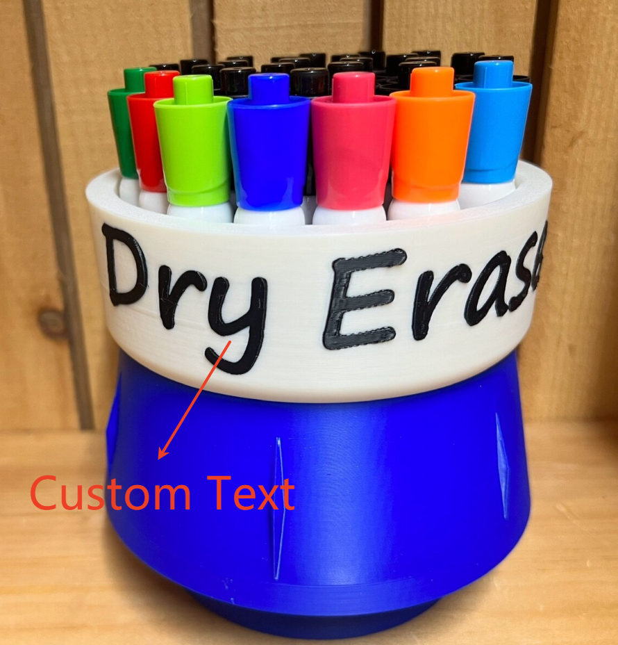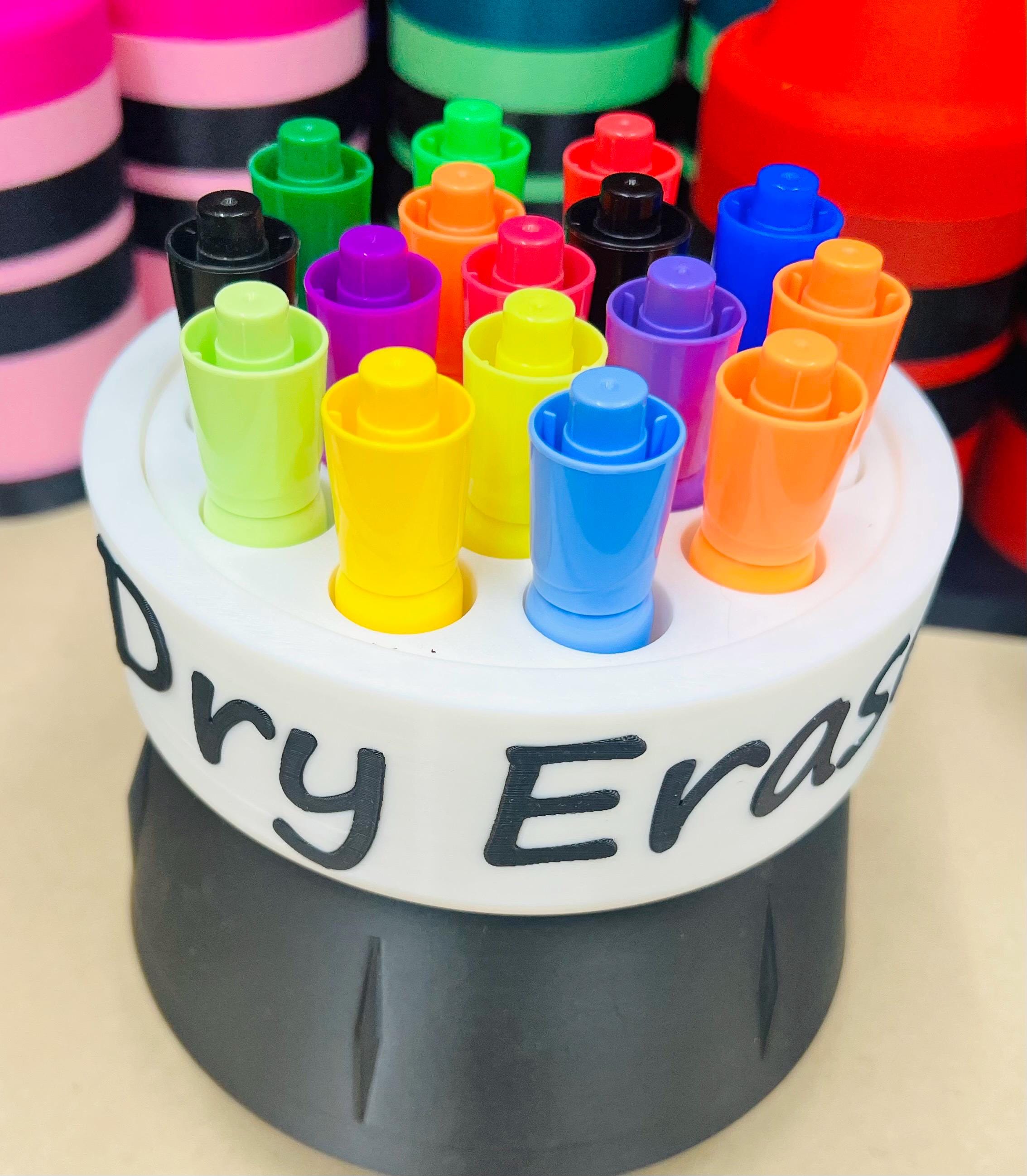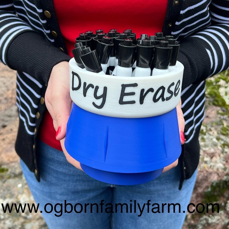 This fun and colorful Dry Erase Marker holder comes in at nearly 5.5" wide, 5.5" tall and a cup depth of 3.6". This marker holder is weighted with sand in the bottom section. Holds 24+ big markers. It is constructed of corn based 100% biodegradable PLA.