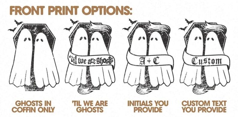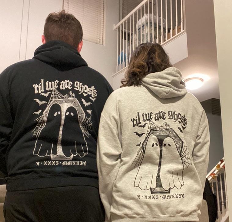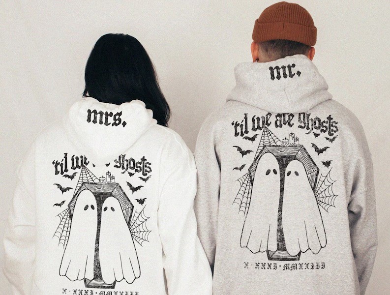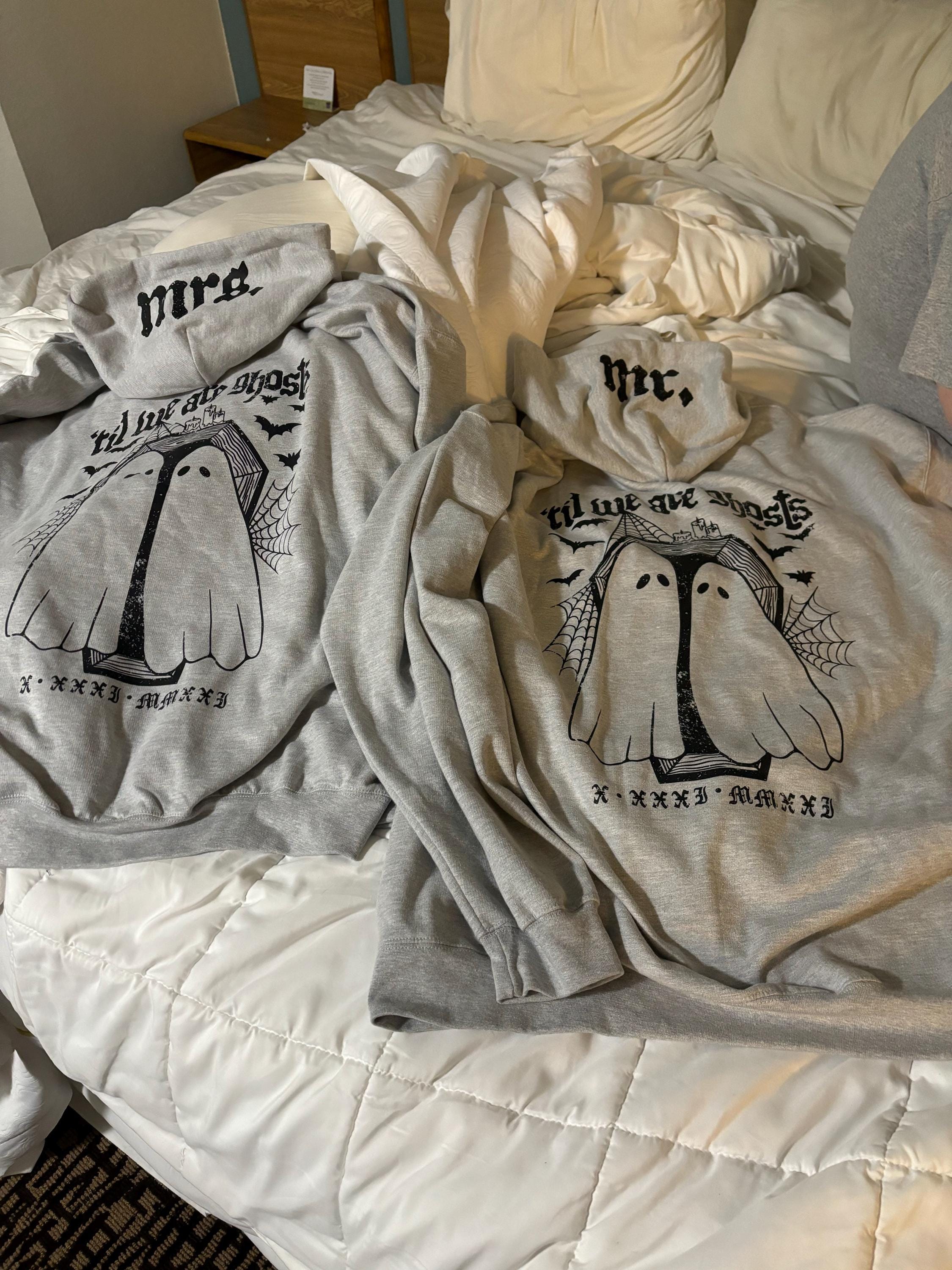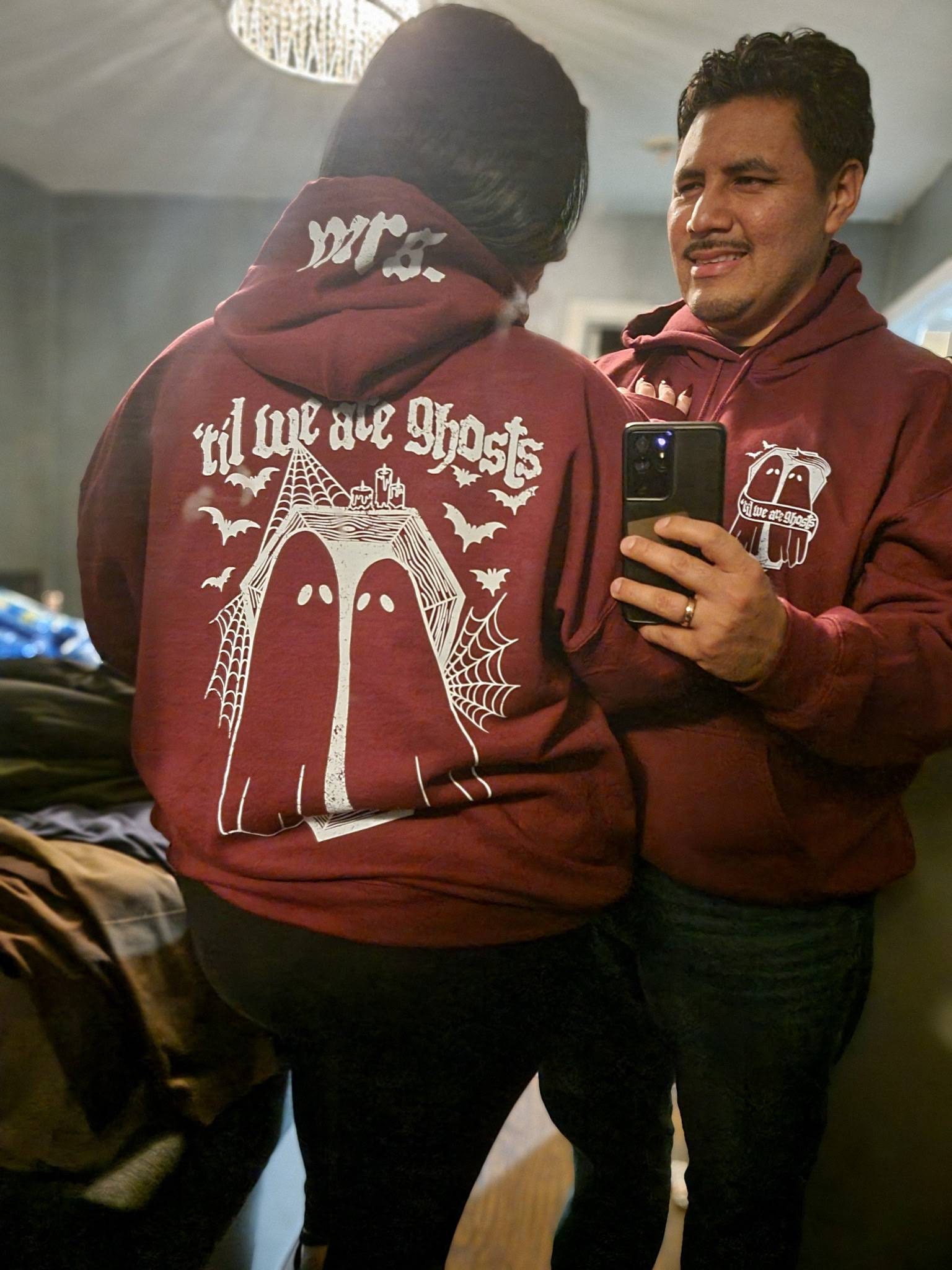 Embrace your inner goth and flaunt your unique bond with our ghost coffin design that scream "couple goals." From the mischievous spirits to the bone-chilling phrase "Til We Are Ghosts," these hoodies are the perfect fusion of spooky and sweet. So, whether you're strolling hand in bony hand at the pumpkin patch or enjoying a candlelit dinner in a haunted house, our matching sweatshirts will keep you in sync and in style!