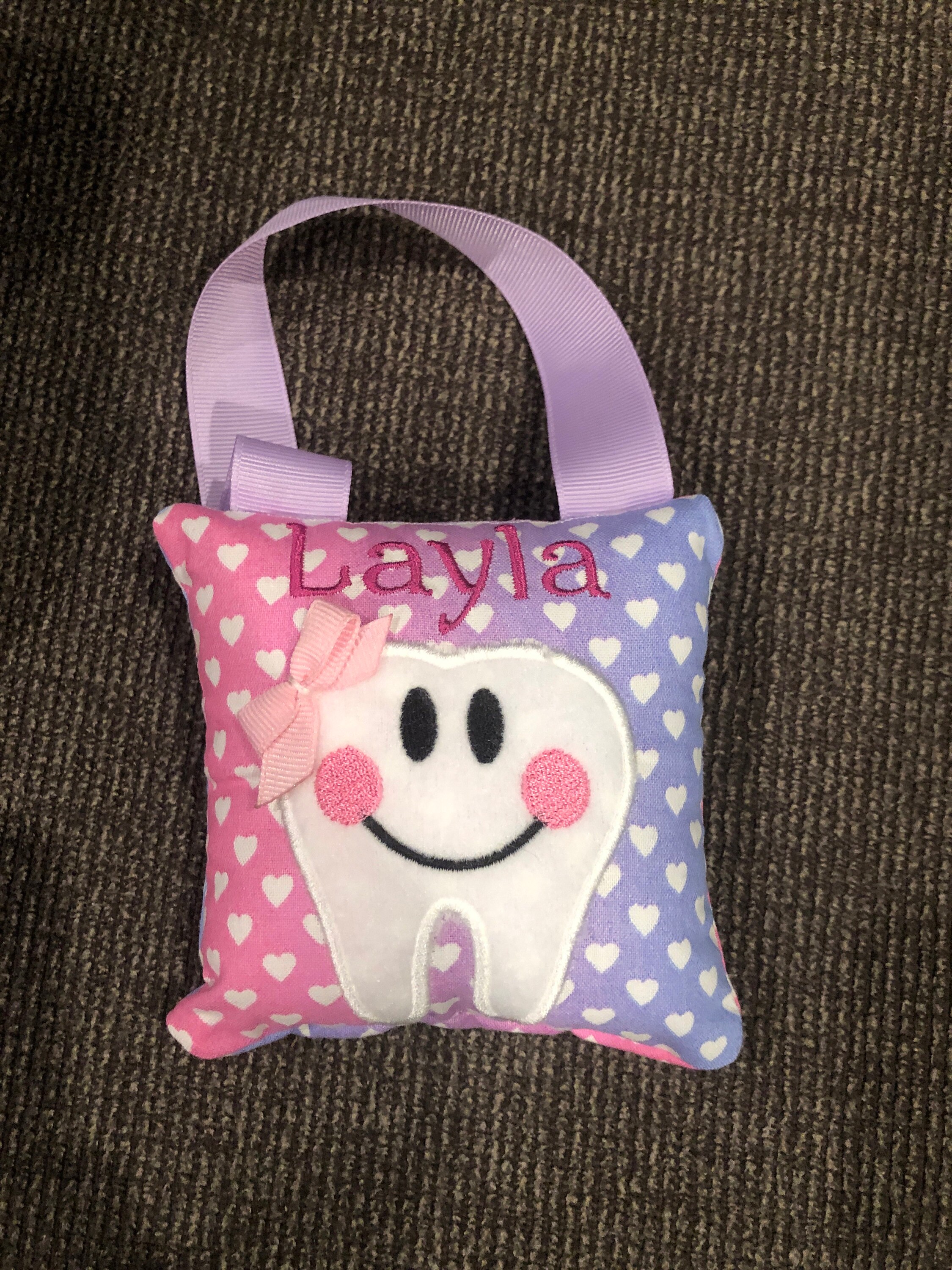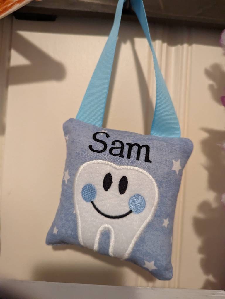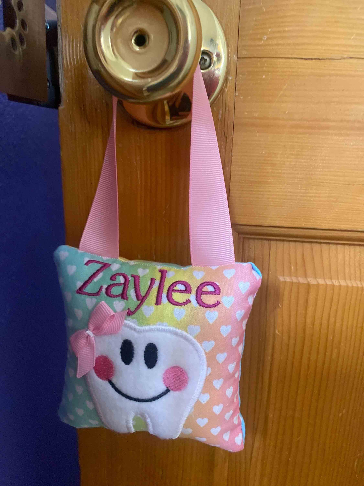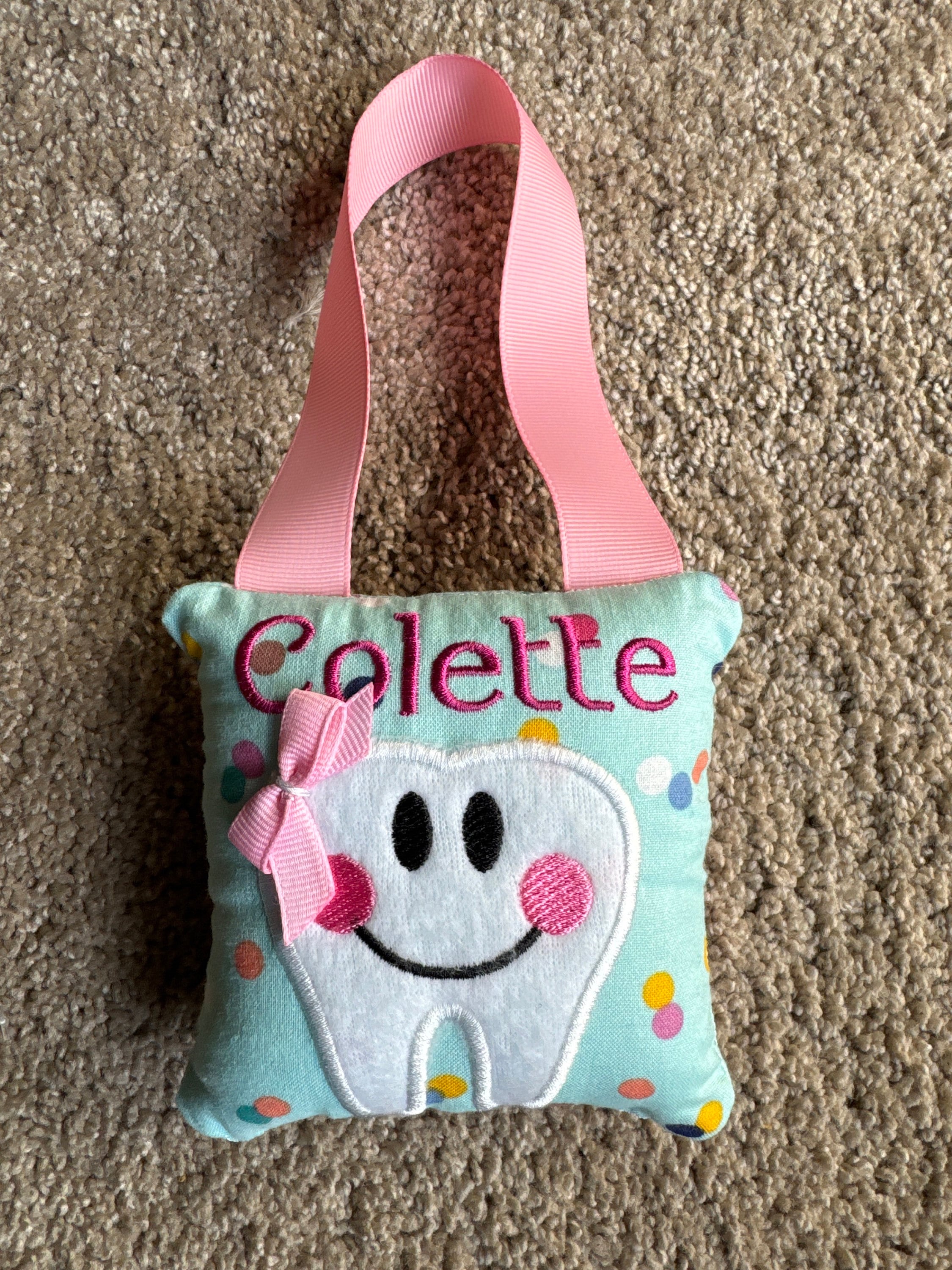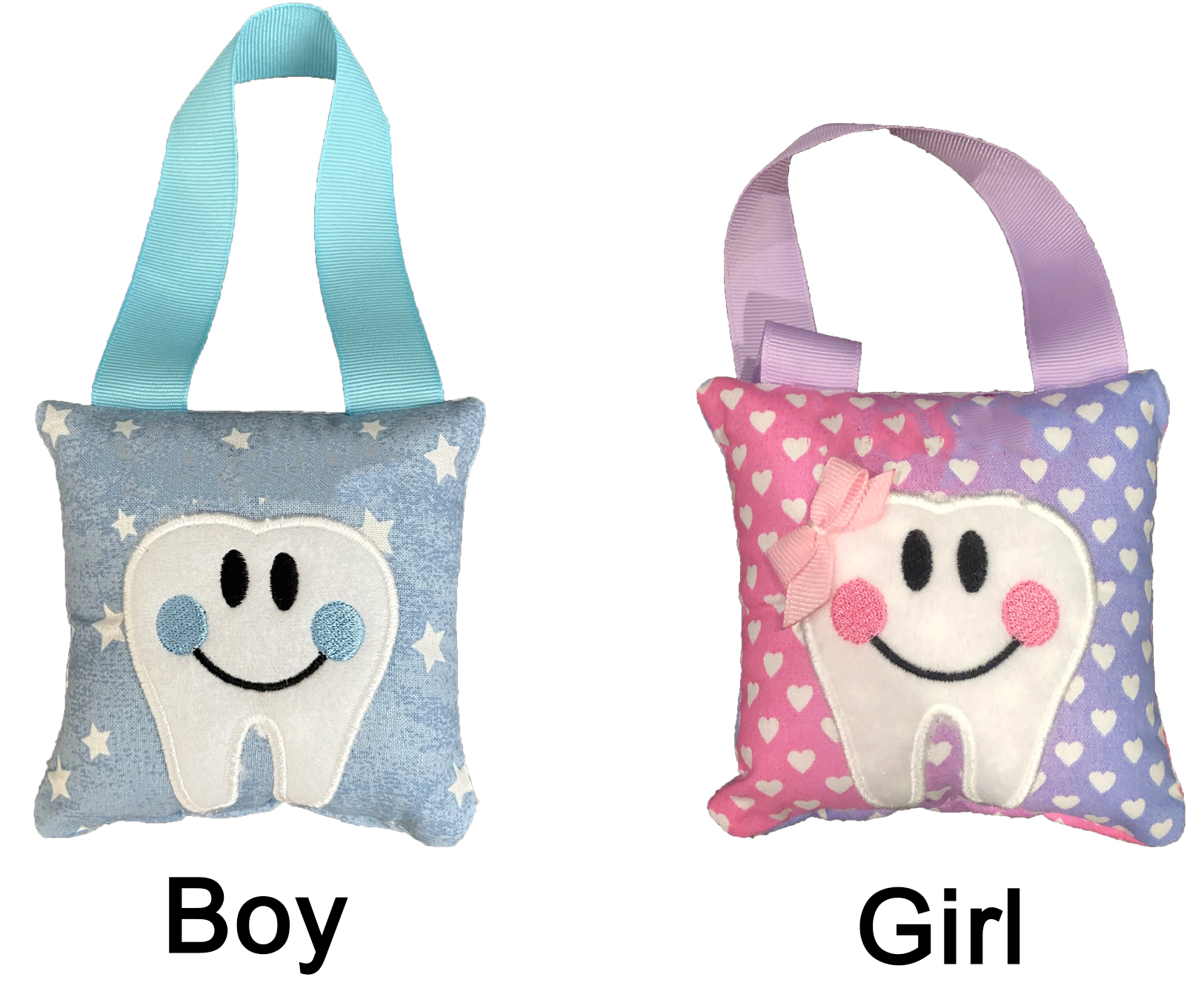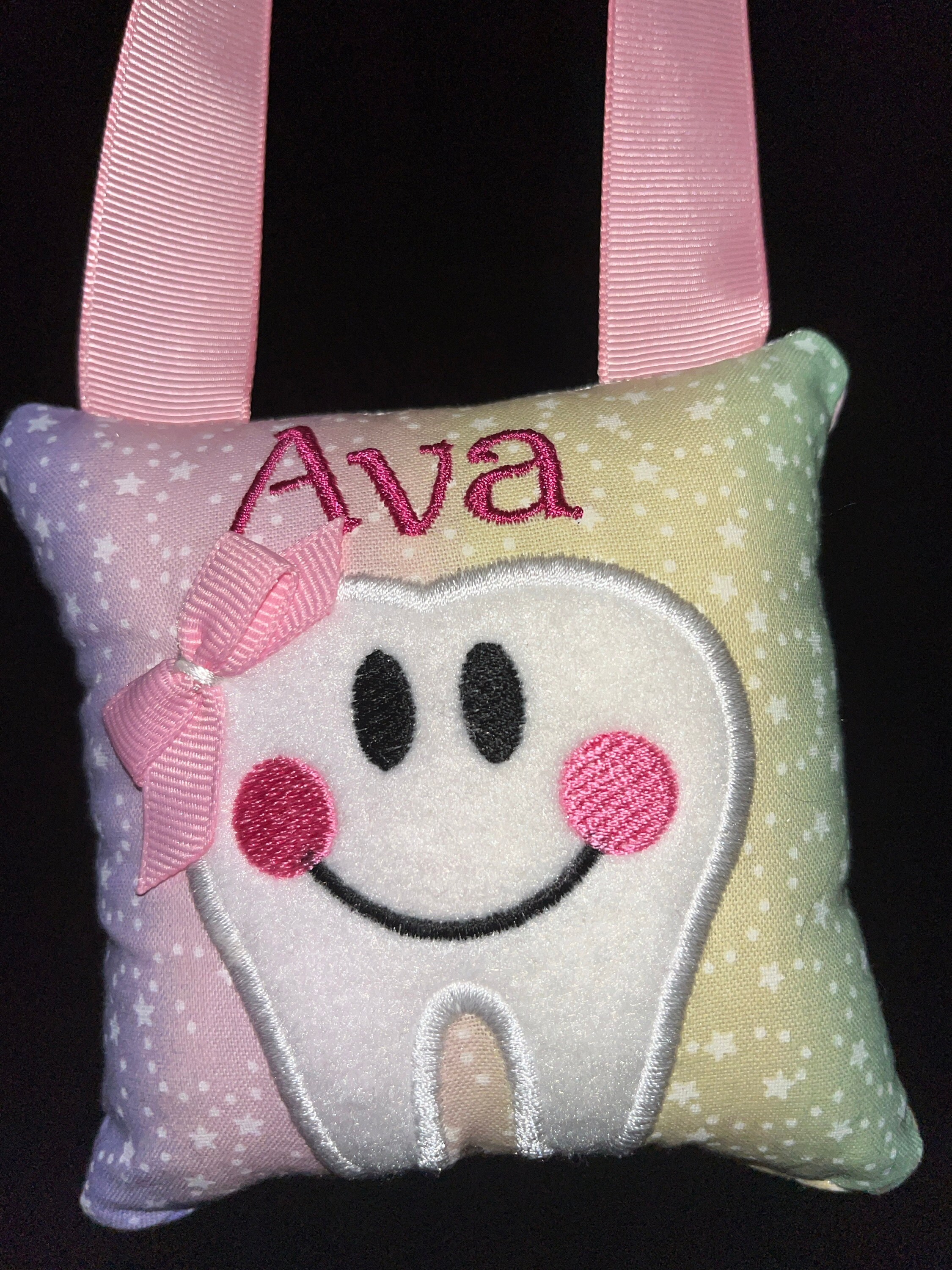 It comes with a beautiful design of a tooth and has a back pocket to put your child's tooth and money from the tooth Fairy. It also comes with a Ribbon to hang the pillow on your doorknob.