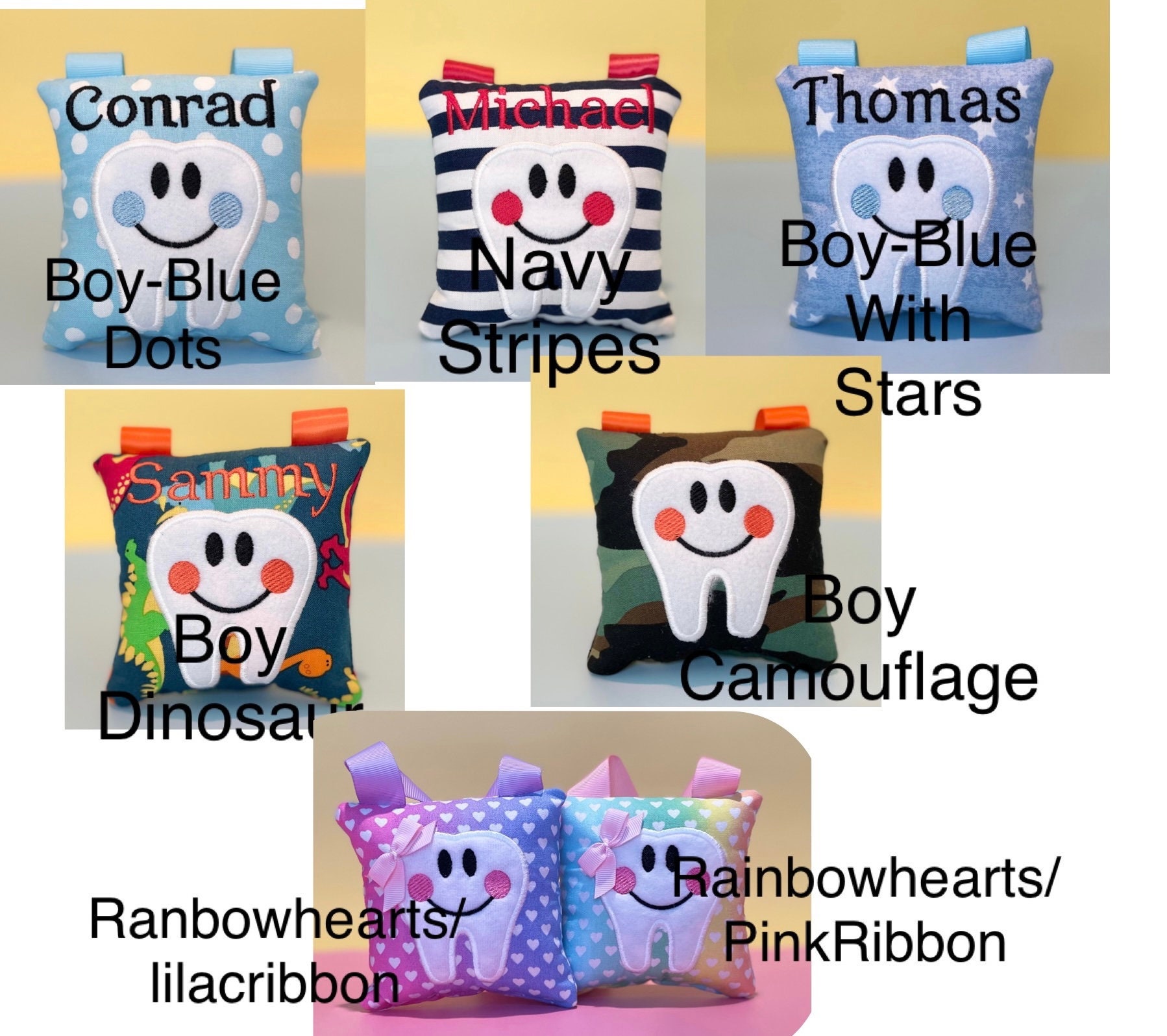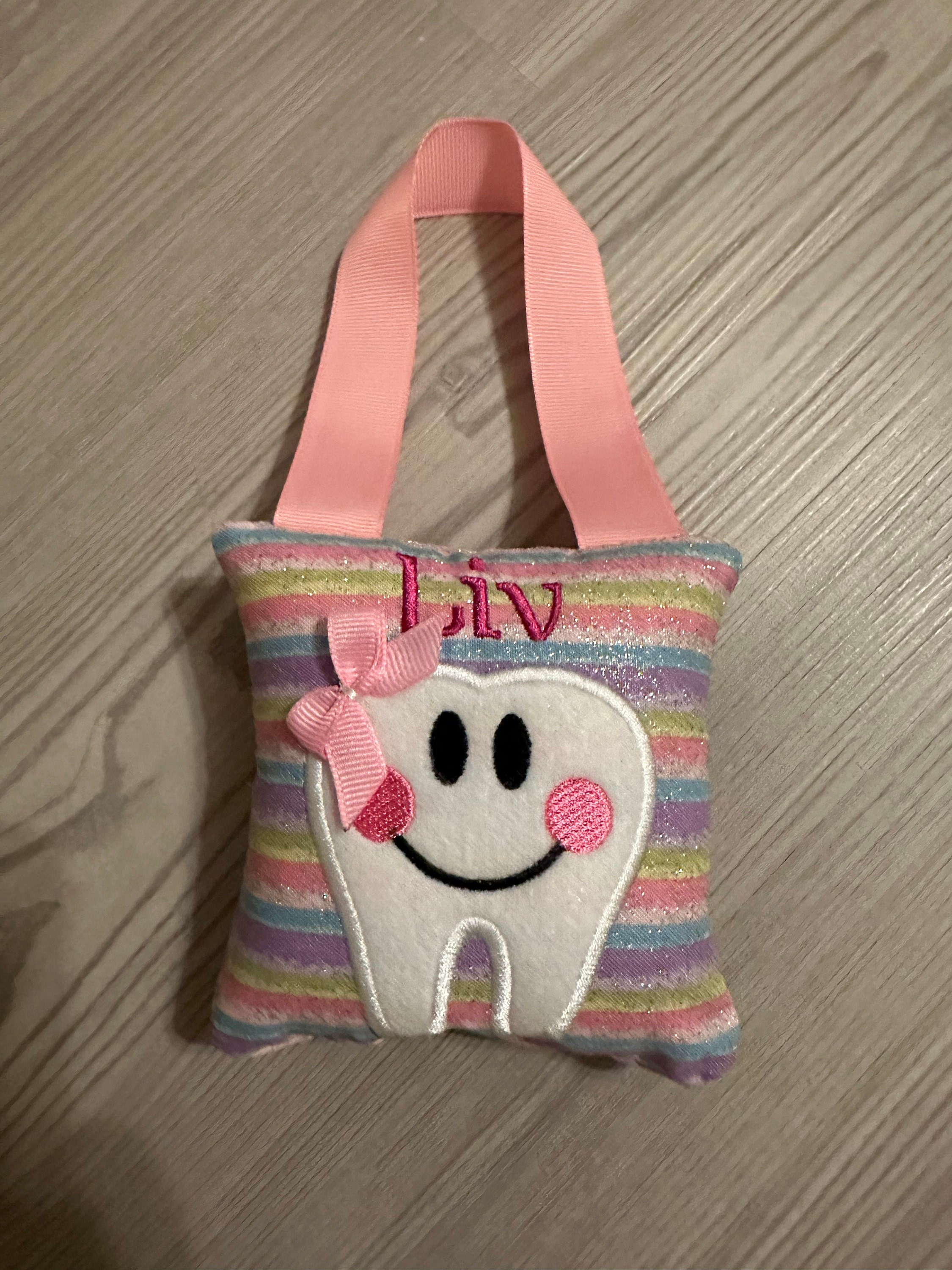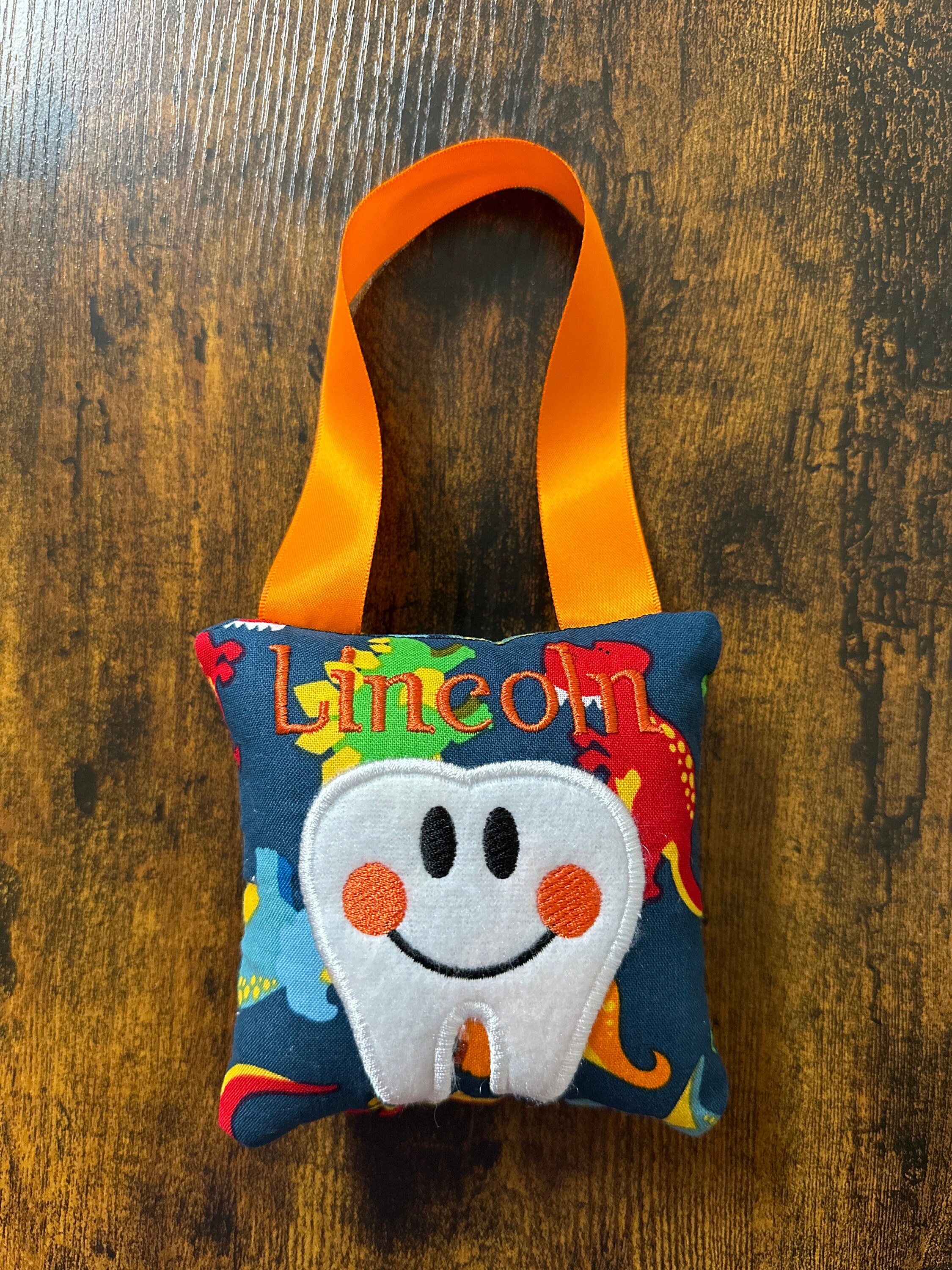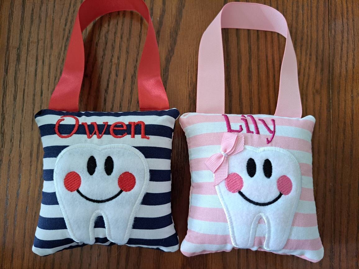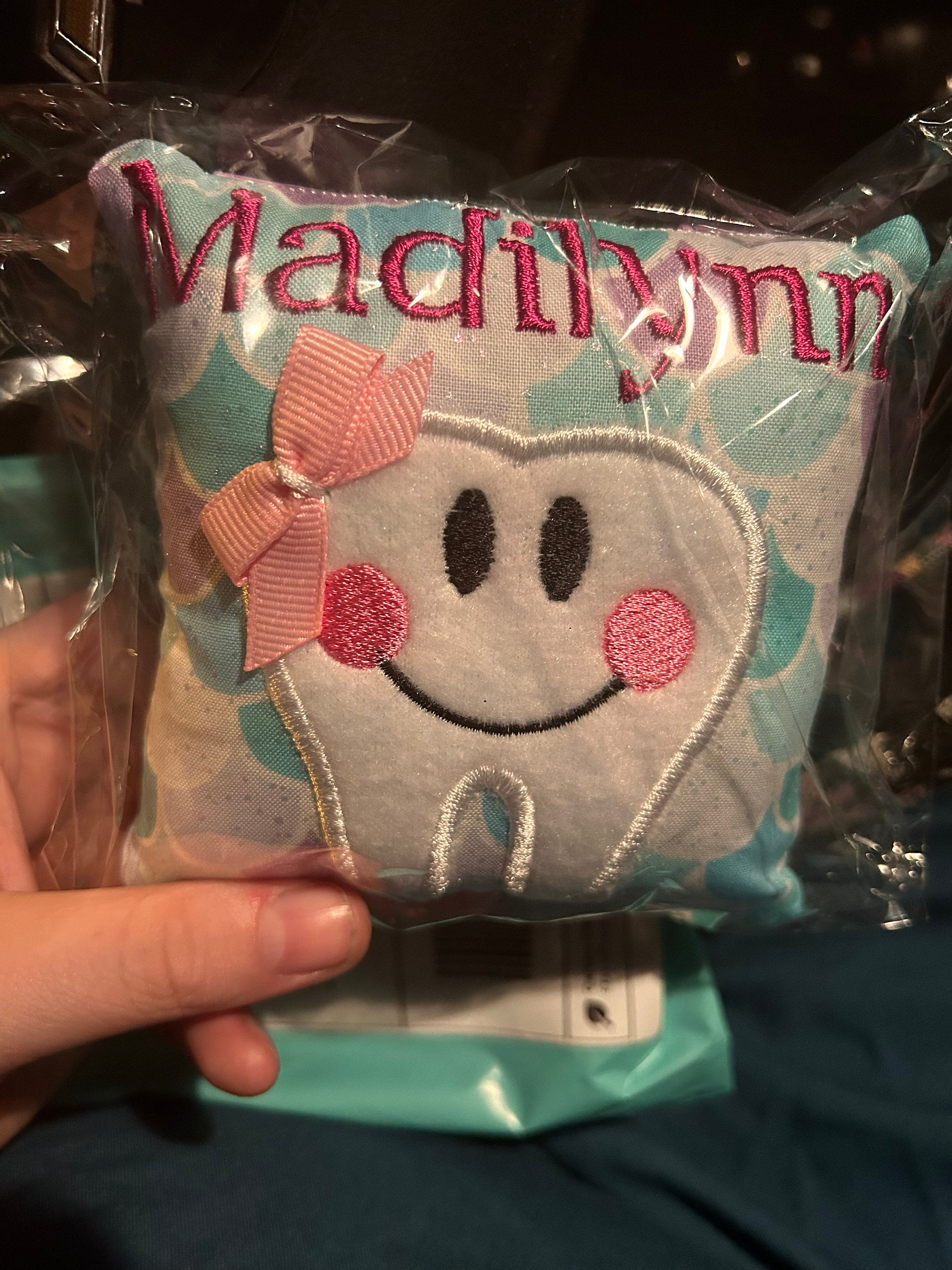 It comes with a beautiful design of a tooth and has a back pocket to put your child's tooth and money from the tooth Fairy. It also comes with a Ribbon to hang the pillow on your doorknob.