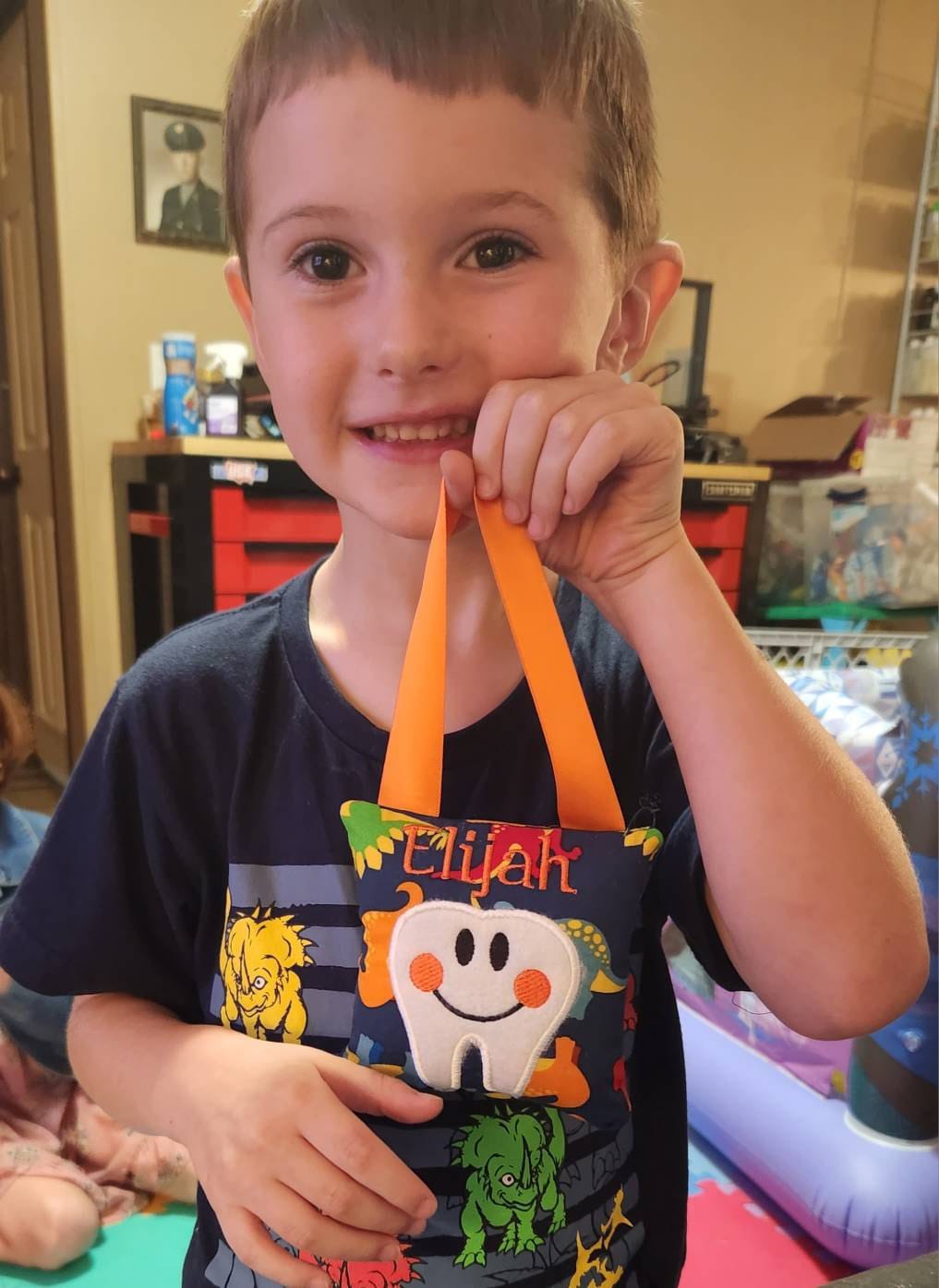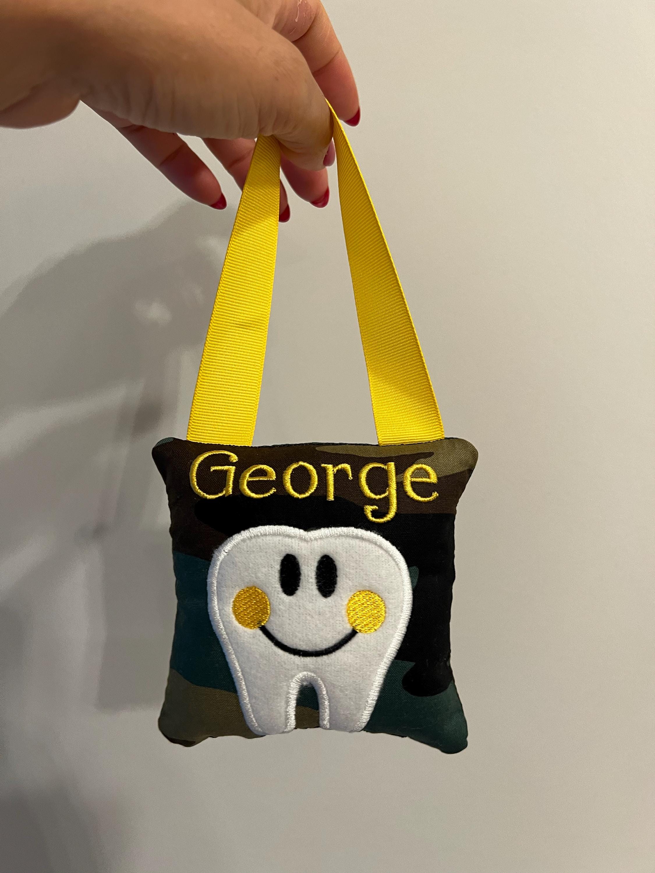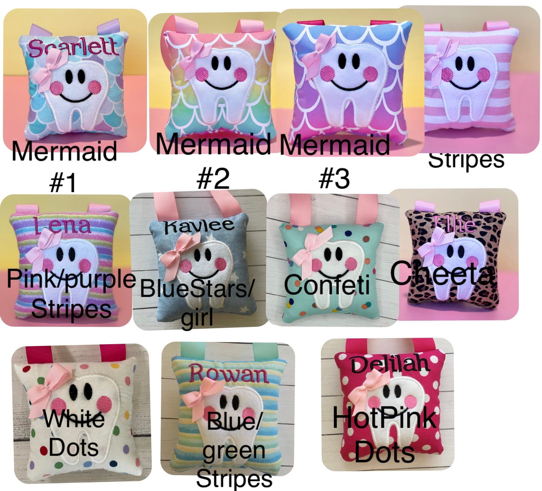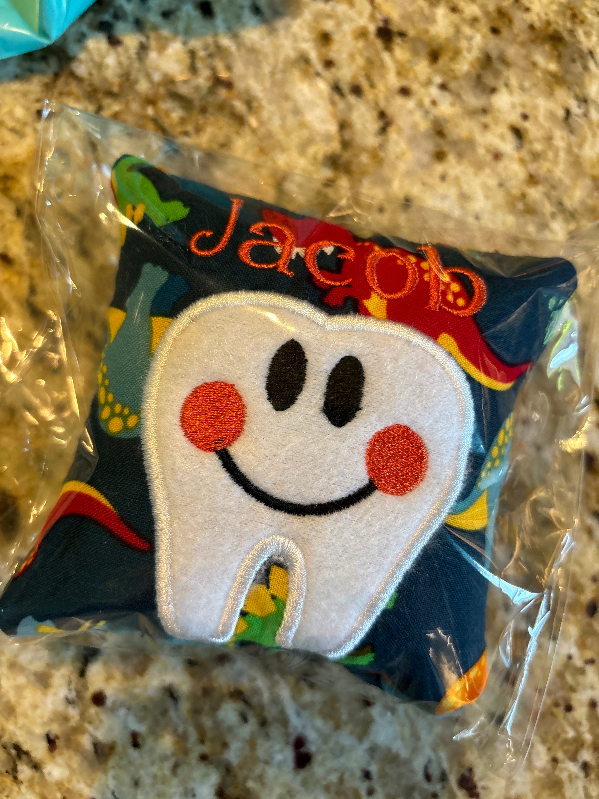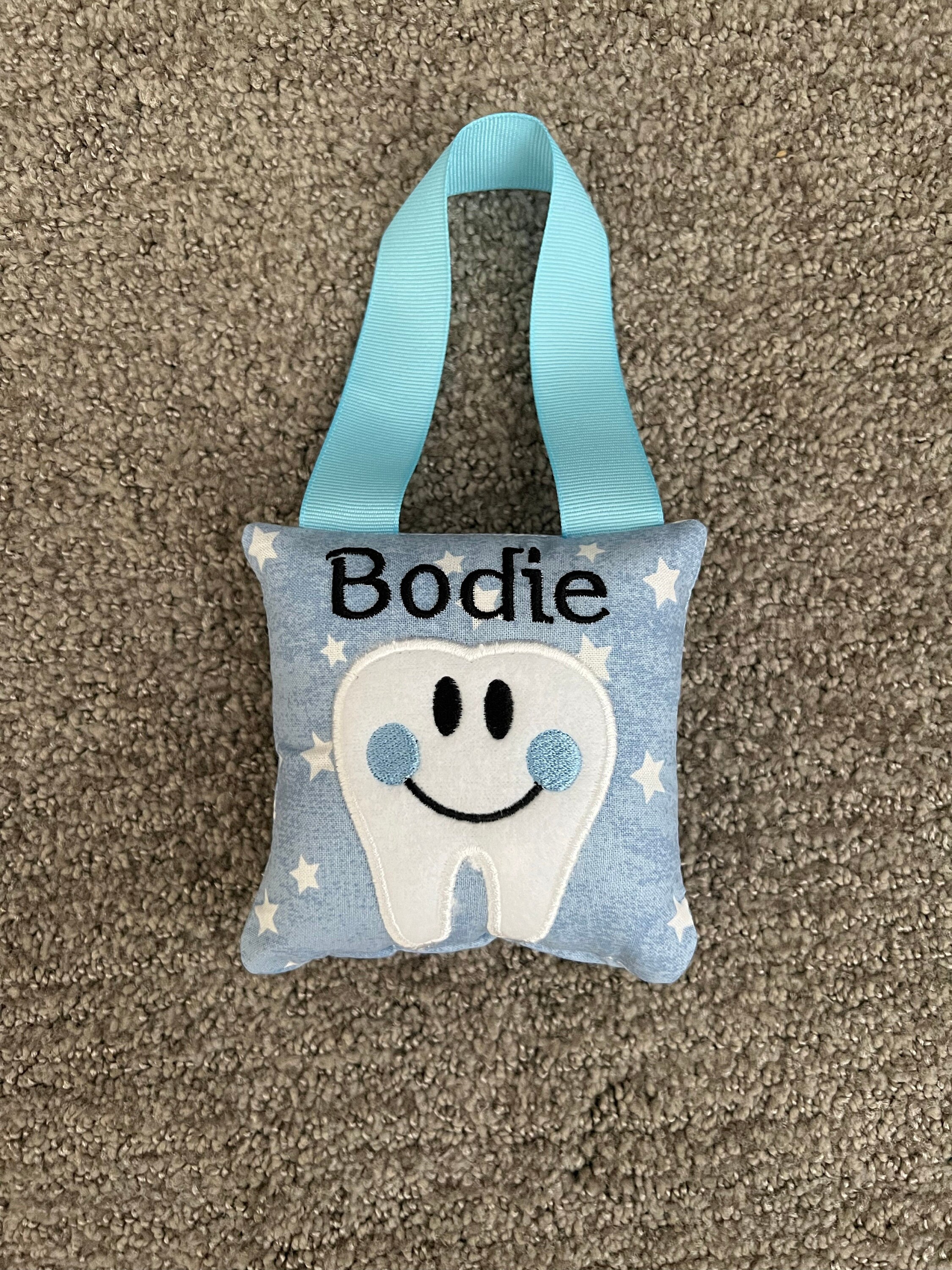 It comes with a beautiful design of a tooth and has a back pocket to put your child's tooth and money from the tooth Fairy. It also comes with a Ribbon to hang the pillow on your doorknob.
