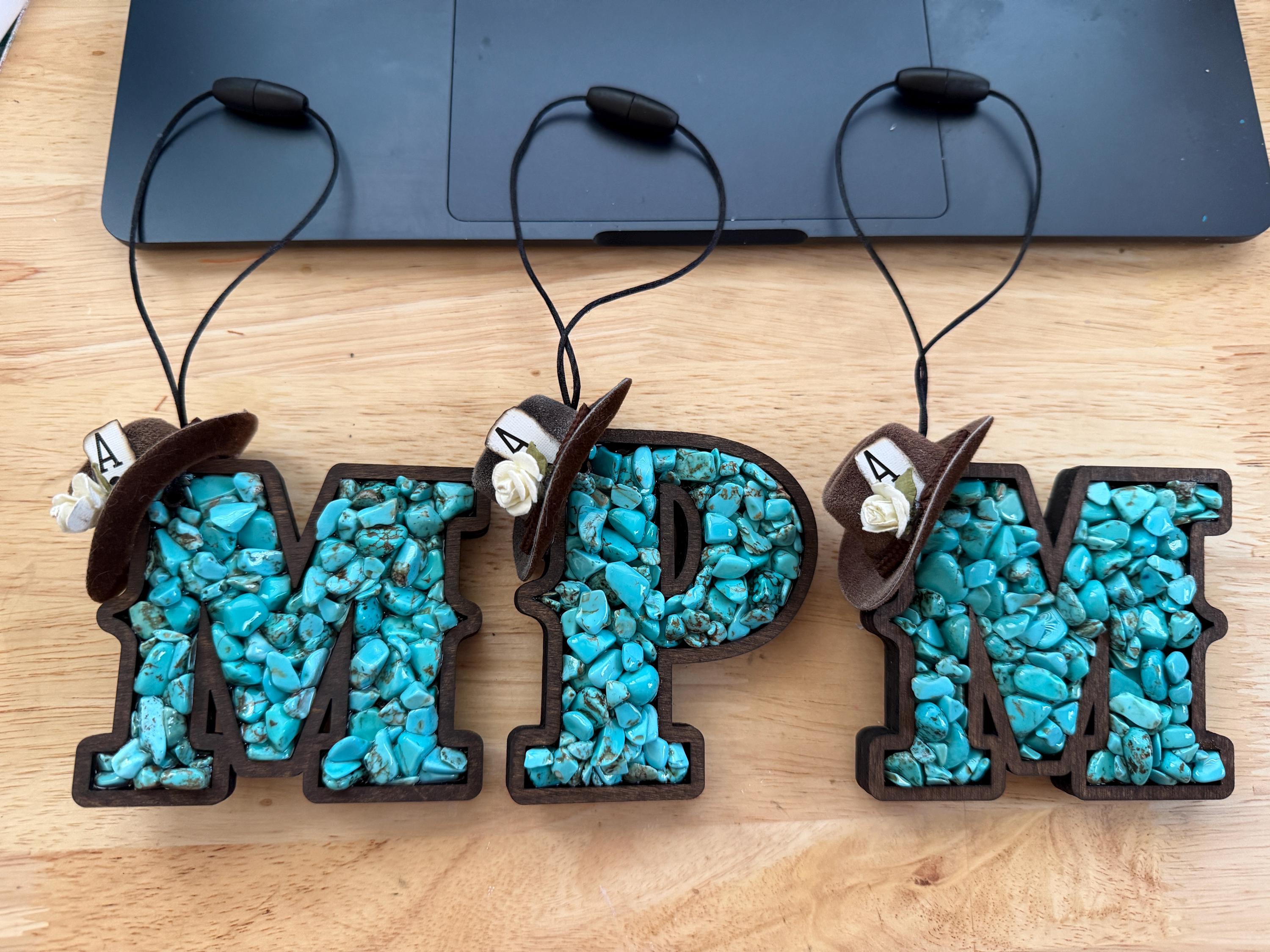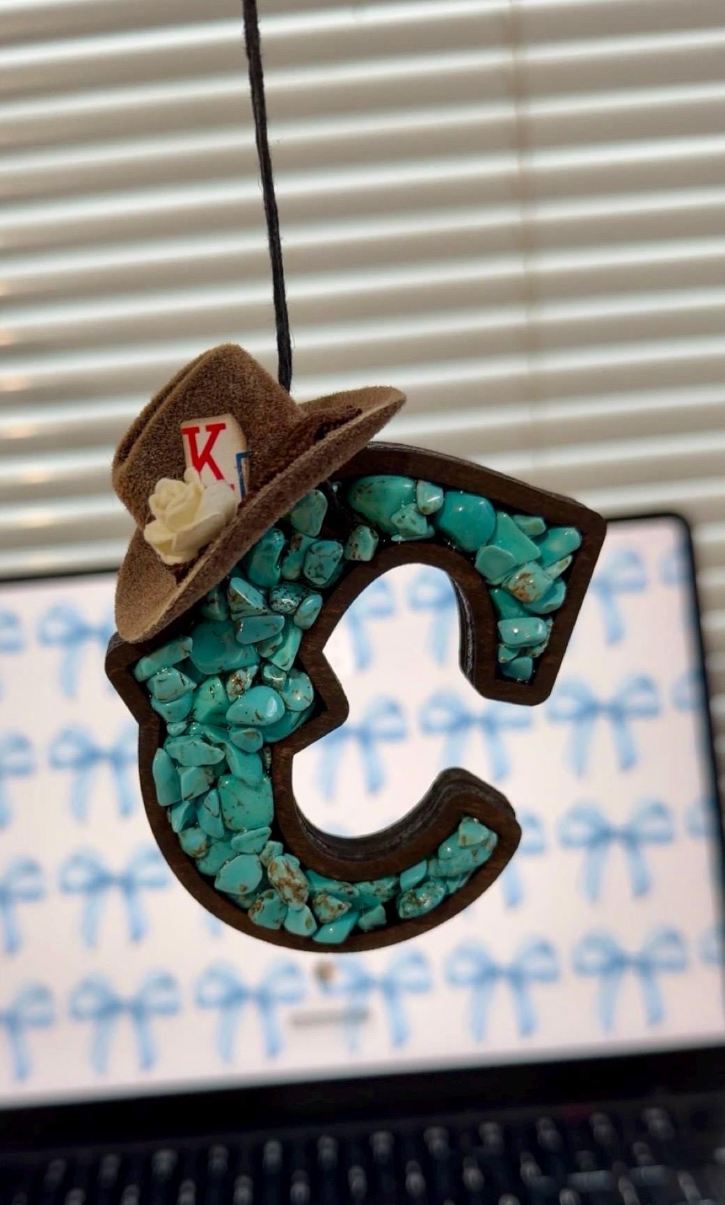 Western Turquoise Letter Rear-View mirror hanger with Cowboy hat.