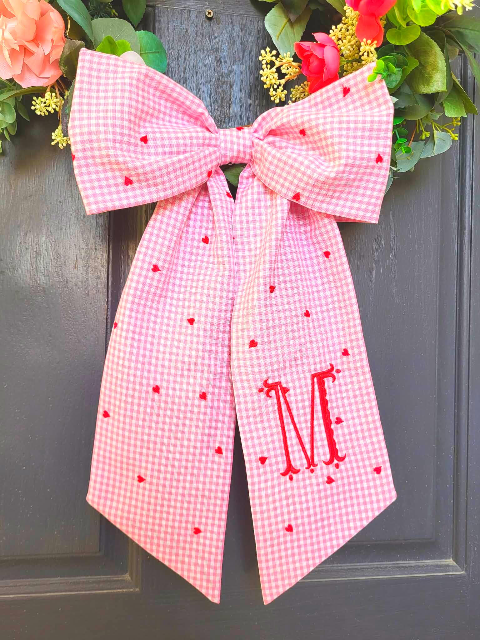Can a Valentine's Day bow look any sweeter than this? You can add this bow to your front door wreath or hang it anywhere on your front porch. It can also be attached to a mirror or a bedroom wall. Get creative! This bow is made from 100% cotton fabric. The background print is pink and white Gingham. There are little red hearts embroidered all over the fabric.